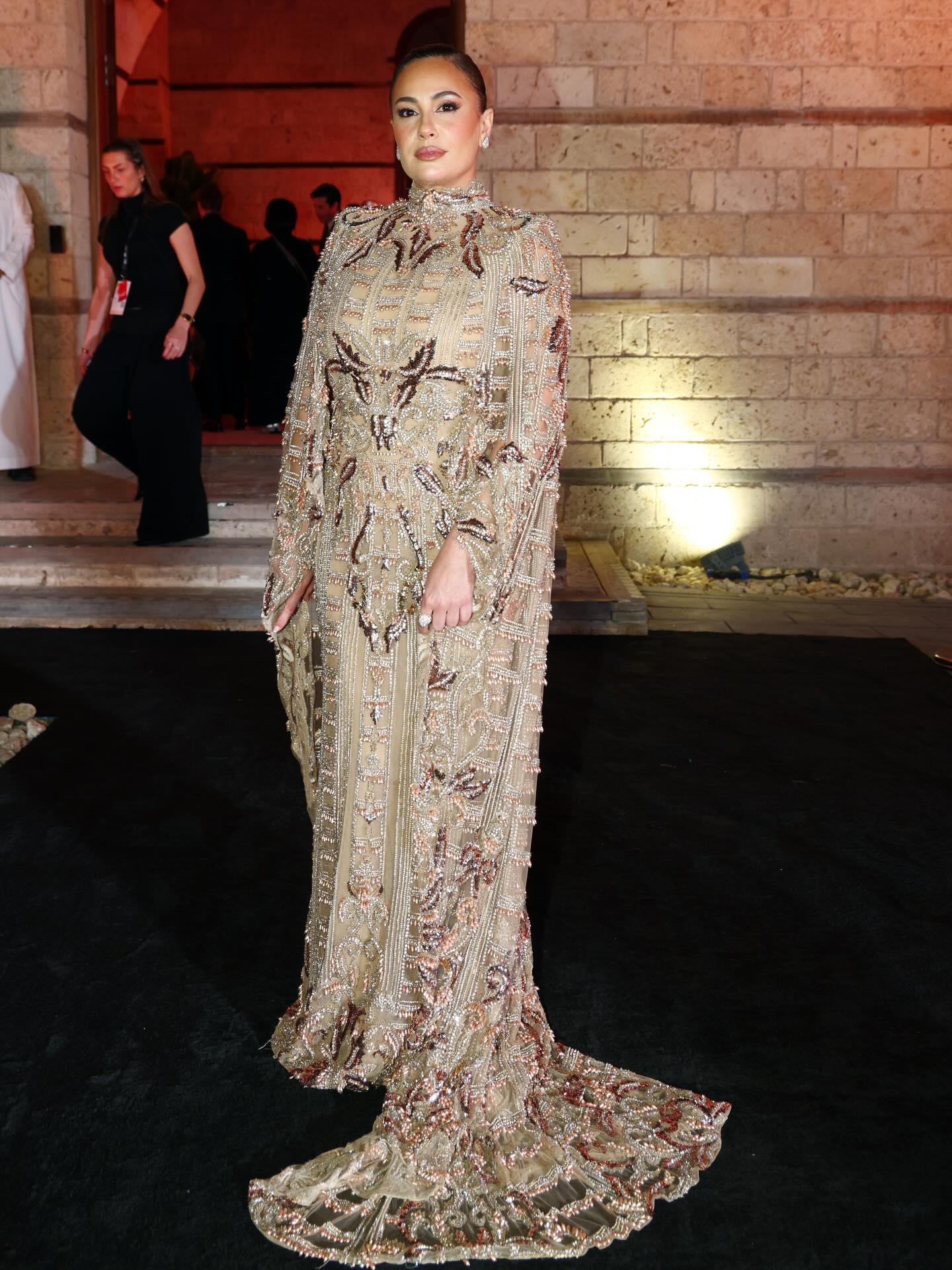 ظهرت هند صبري بفستان من زهير مراد بطابع رسمي واضح. التصميم مستقيم مع ياقة مرتفعة، فيما أضيف كاب طويل مطرّز بالكامل ليمنح الفستان حضوراً قوياً. امتد الذيل الخلفي بزخارف دقيقة بلون يجمع بين الذهبي والنيود اللامع، ما أبرز تفاصيل التطريز الغني.