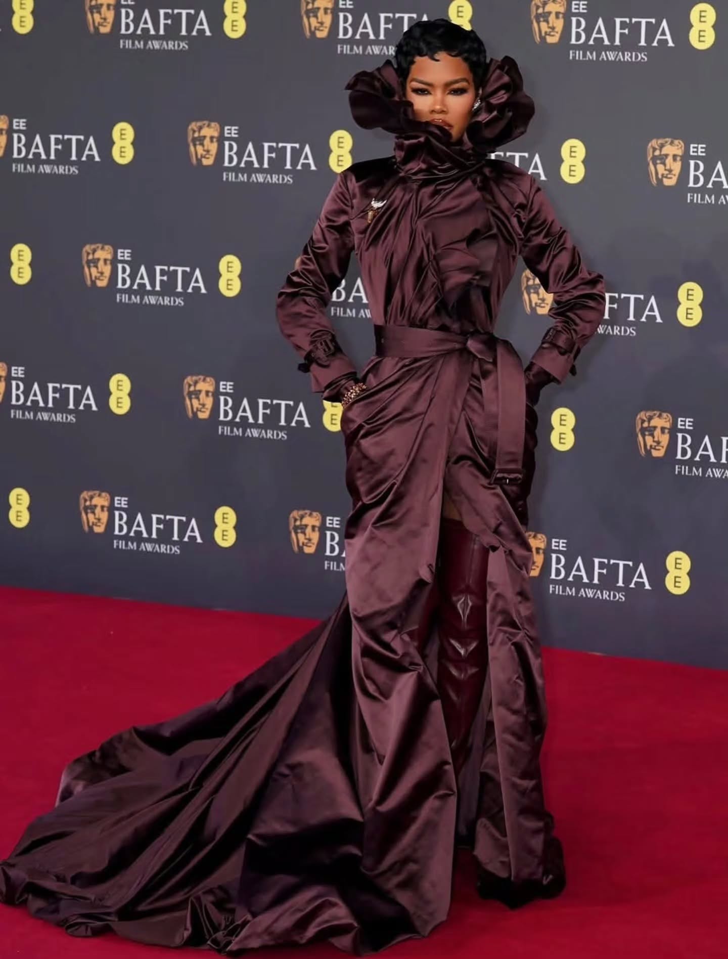 بفستان طويل من Burberry، خطفت تيانا تايلور الأنظار بلون برغندي غني وتفاصيل معمارية قوية. الإطلالة جسدت الجرأة والقوة، مع حضور مسرحي متقن على السجادة الحمراء.