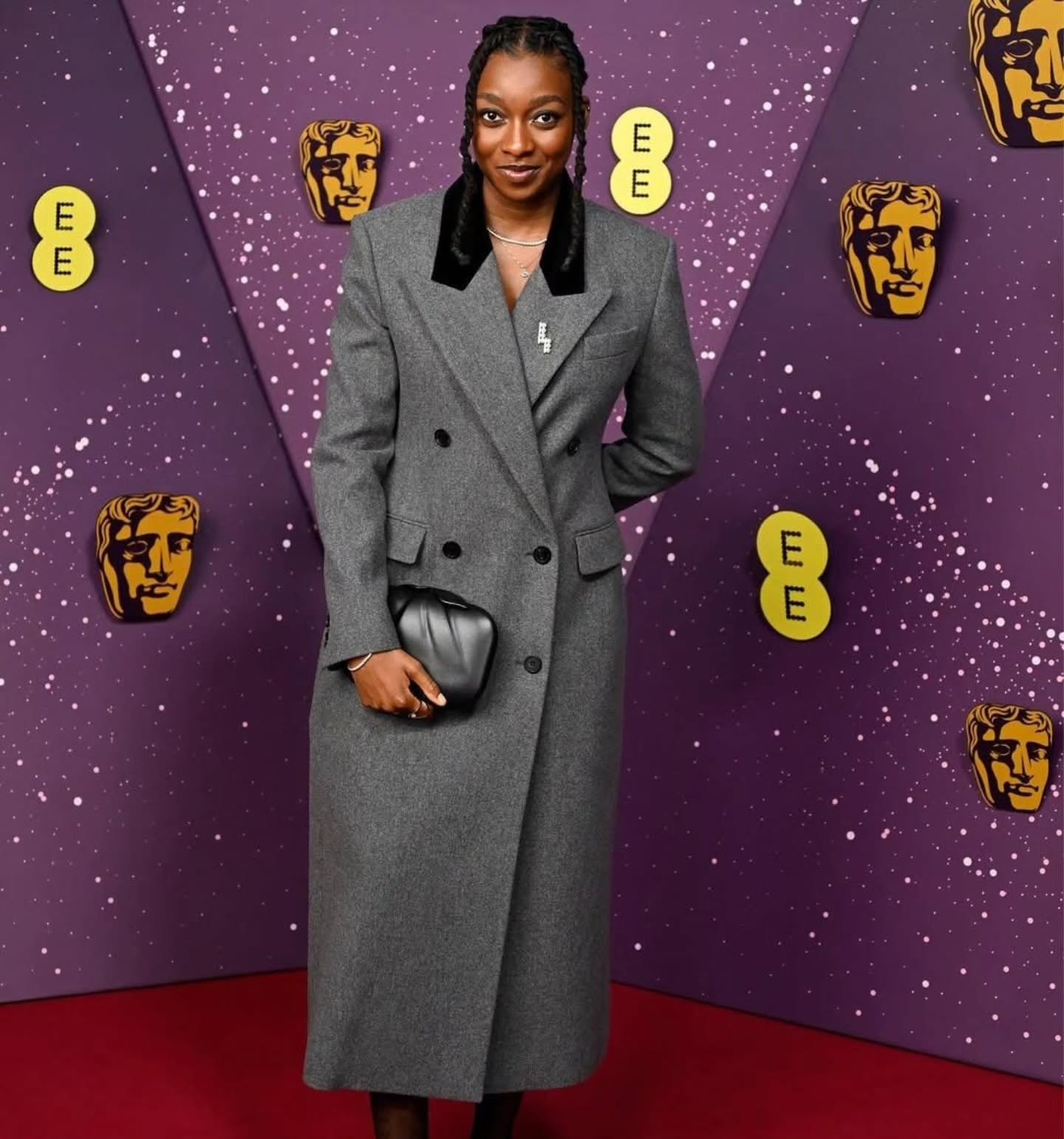 في ظهورها الأول على سجادة بافتا، اختارت فستانًا مخصصًا من Gucci باللون الفضي المتلألئ، وأكملت الإطلالة بلمسة فرو بيضاء أضافت طابعًا كلاسيكيًا مترفًا. حضورها جاء ناعمًا لكنه لافت بكل المقاييس.