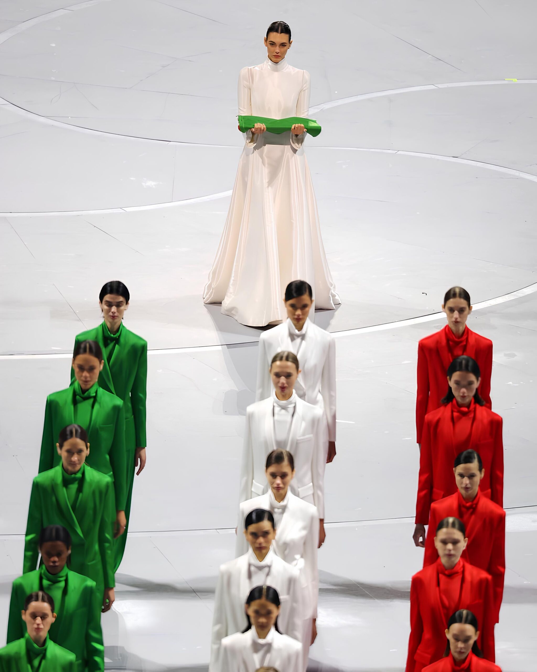 كما شاركت في ذات العرض العارضة الإيطالية Vittoria Ceretti بإطلالة أنيقة من Armani Privé، بفستان أبيض طويل وياقة عالية، حاملة العلم الإيطالي خلال الاحتفال،