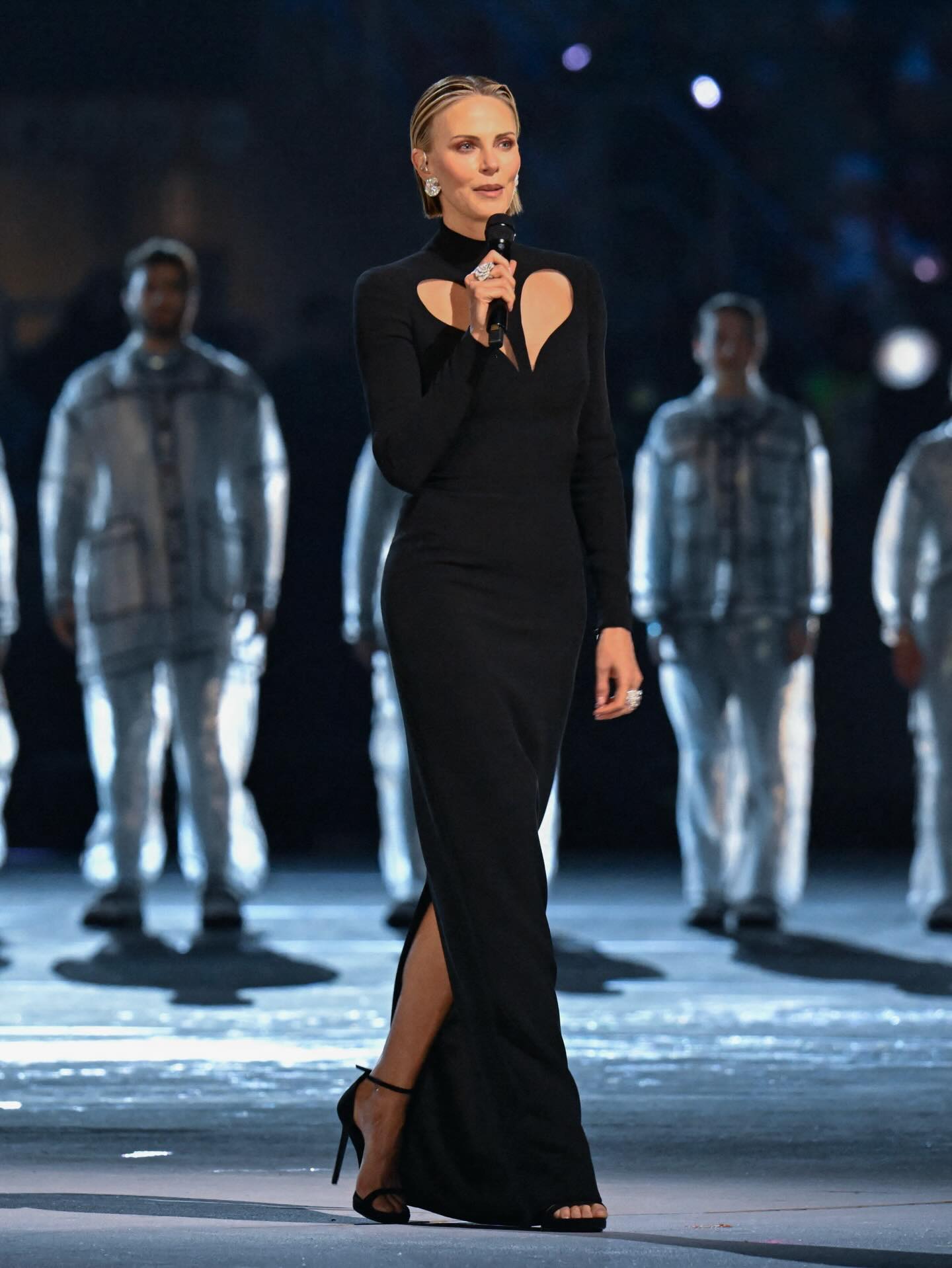 أما Charlize Theron، فاختارت فستانًا أسود طويلًا من Versace بأكمام طويلة وتفصيل رمزي عند الترقوة على شكل قلب، مع مجوهرات مرصعة وأحذية مفتوحة، لتجمع بين الأناقة الكلاسيكية والطابع العصري ورسالة سلام وإنسانية.