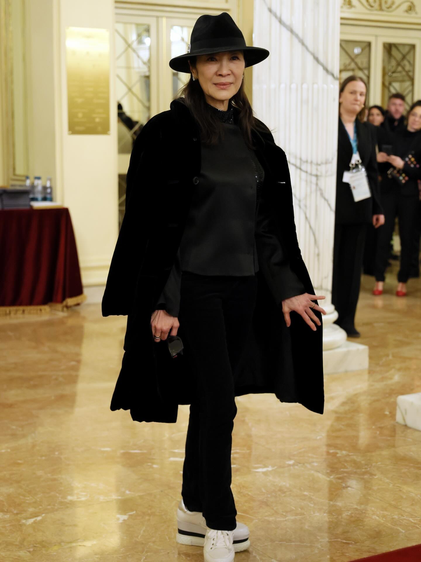 Michelle Yeoh اختارت أسلوبًا أنيقًا بطابع فني، يغلب عليه اللون الأسود بأسلوب متناغم ومريح. ارتدت معطفًا واسعًا وقبعة، ما أضفى حضورًا قويًا ولمسة كلاسيكية بارزة، بينما منح الحذاء الرياضي توازنًا عصريًا بين الأناقة والوظيفة العملية، لتعكس ذوقًا واثقًا وشخصية هادئة تميل إلى البساطة المدروسة.
