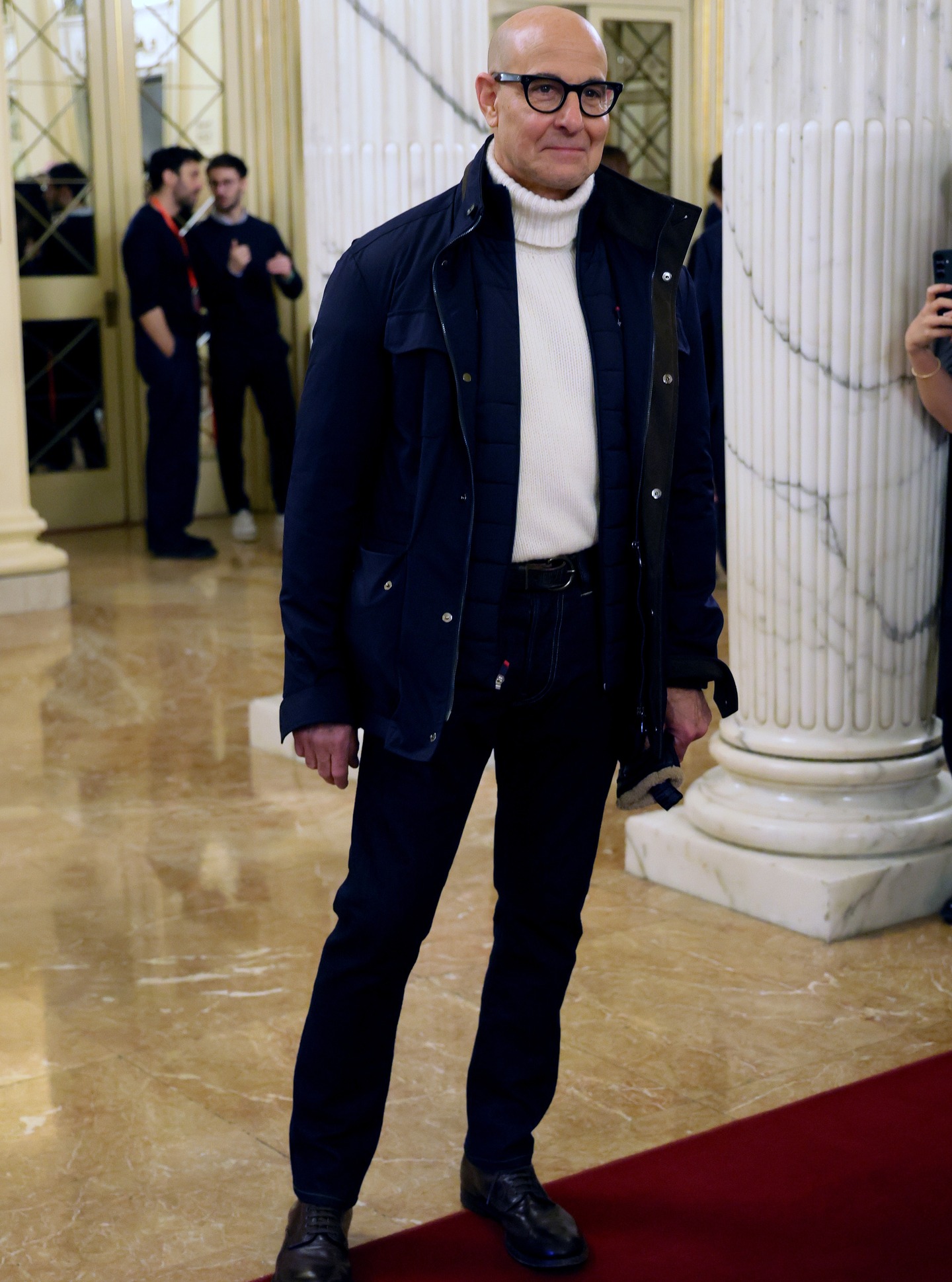 Stanley Tucci اختار مزيجًا من الكلاسيكية العصرية، مع سترة مبطنة ومعطف عملي بالدرجات الداكنة، وياقة مرتفعة تضيف لمسة فخمة