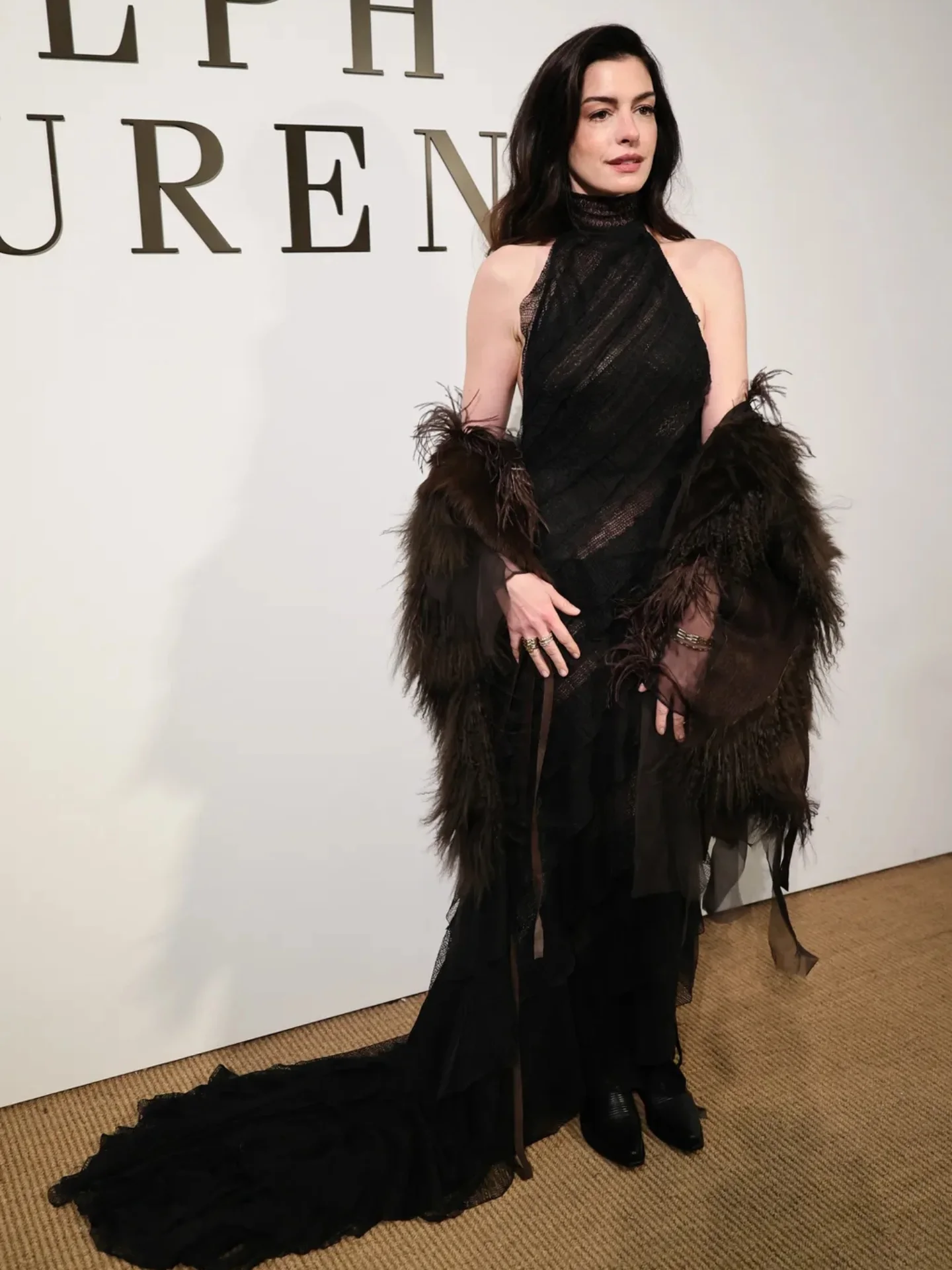 خطفت Anne Hathaway الأنظار بفستان أسود شفاف طويل بدون ظهر ، تميز بطبقات دانتيل مطرزة بشكل قطري وأكمام مكشوفة الأكتاف، مع قطار طويل ينساب بانسيابية خلفها.