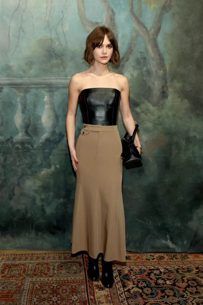 بدت Emilia Jones عصرية وواثقة بإطلالة من Ralph Lauren FW25، حيث ارتدت كورسيه جلديًا أسود بدون أكمام مع تنورة ميدي بيج بقصة انسيابية. نسقت اللوك مع حقيبة وبوت أسودين، محققة توازنًا جذابًا بين الجرأة والبساطة الأنثوية.
