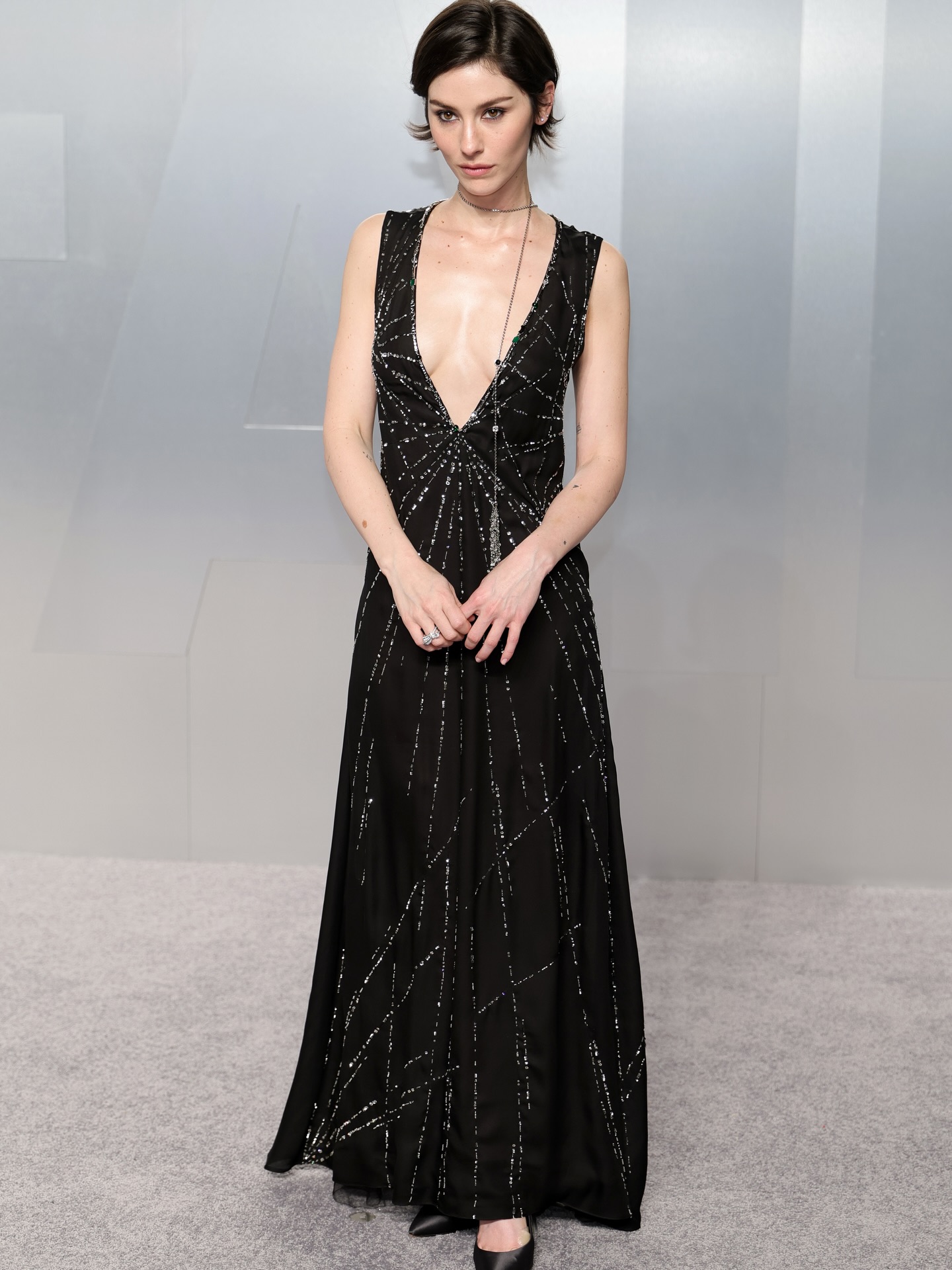 ارتدت فستانًا أسود انسيابيًا مزينًا بخطوط فضية، ما أضفى على إطلالتها لمسة من الأناقة الراقية واللمعان الرقيق على السجادة الحمراء.