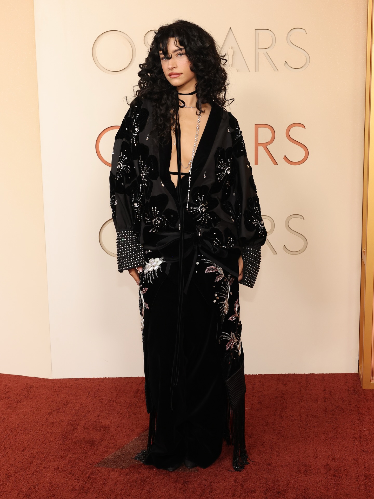 لفتت Grace Van Patten الأنظار بفستان مخملي فاخر من Georges Chakra، تميز بقصّة عمودية وفتحة عنق غير متماثلة، مع ظهر شفاف مزين بالخرز وذيل من التول المطرّز، ما أضفى لمسة راقية وفاخرة. أما Kirsten Dunst فاختارت البساطة الراقية بفستان أسود من Celine، بقصة كلاسيكية وخطوط نظيفة أبرزت أناقتها الهادئة.