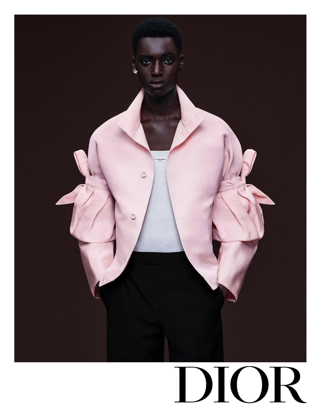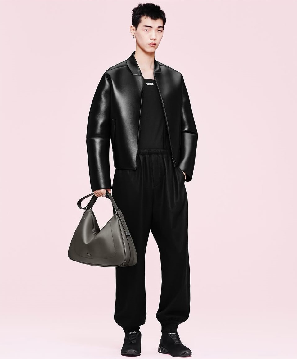برزت الشرائط الحريرية كعنصر متكرر في التصاميم، لا سيما في الجاكيت ذو الياقة القائمة. ظهر هذا الجاكيت لأول مرة ضمن عرض أزياء الرجال لخريف وشتاء 2025-2026. صُمم من تافتا حريري وردي مقاوم للماء، ويأتي بإغلاق أمامي بالأزرار وتفاصيل أساور الأكمام المربوطة. استُوحيت هذه التفاصيل من خط A Line الذي ابتكره Christian Dior. يعكس الجاكيت روح المجموعة، ويتيح تنسيقه بسهولة مع قطع أخرى لإطلالة راقية ومميزة.