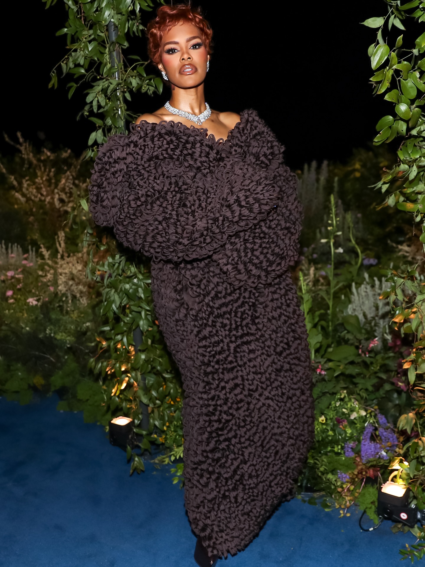 ظهرت Gabrielle Union-Wade بإطلالة أنيقة من توقيع Salih Balta FW26 RTW، حيث ارتدت فستانًا سترابلس ضيّقًا (bustier gown) يبرز القوام بأسلوب كلاسيكي راقٍ. جاء التصميم بتدرج لوني من الأسود العميق في الأعلى إلى البني الدافئ مع تفاصيل لامعة على التنورة، ما خلق تأثيرًا أومبريه غنيًا بالعمق والحركة.