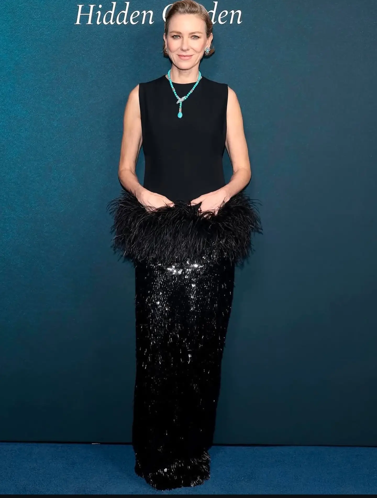 ارتدت فستانًا بفتحة صدر منخفضة (low sleeveless top) مع خصر محدد مزين بتفصيل من الريش (feather peplum)، بينما جاءت التنورة مغطاة بالترتر الأسود اللامع الذي يعكس الضوء بطريقة لافتة.