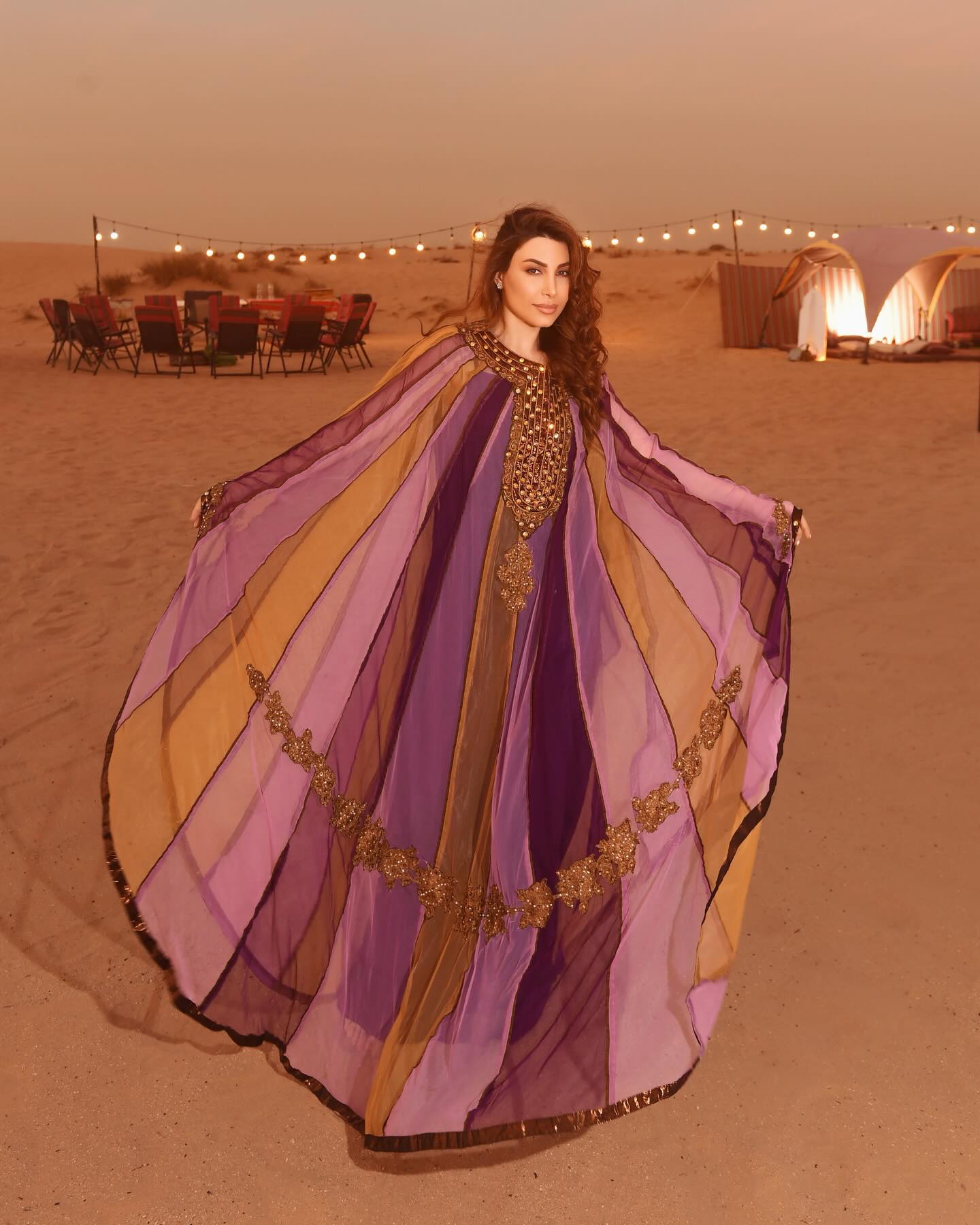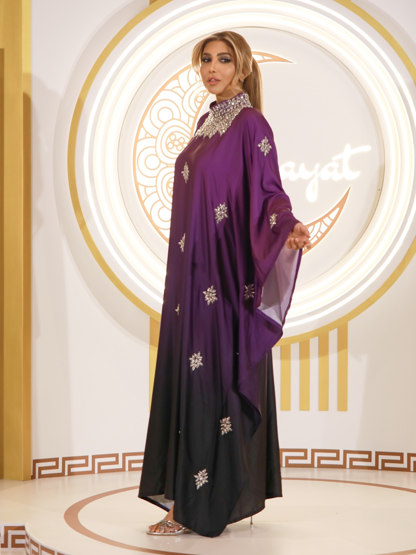 يارا اختارت عباءة واسعة من أقمشة شفافة بألوان البنفسجي والذهبي، تزيّنت بتطريزات لامعة أضفت فخامة واضحة على التصميم، فبدت الإطلالة مترفة وملائمة للأمسيات الرمضانية.