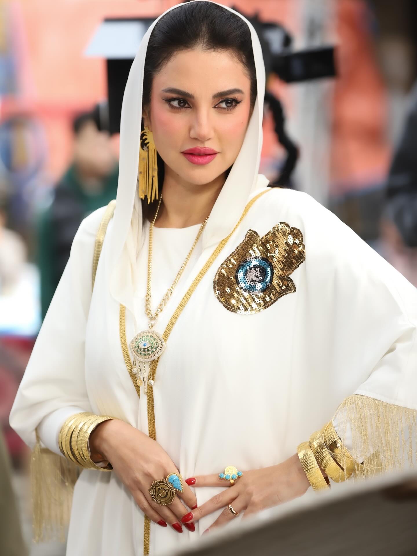 جويل ماردينيان اختارت قفطاناً أبيض مزداناً بورود ذهبية، ونسّقته مع عباءة ذهبية أضفت بعداً فاخراً على الإطلالة.