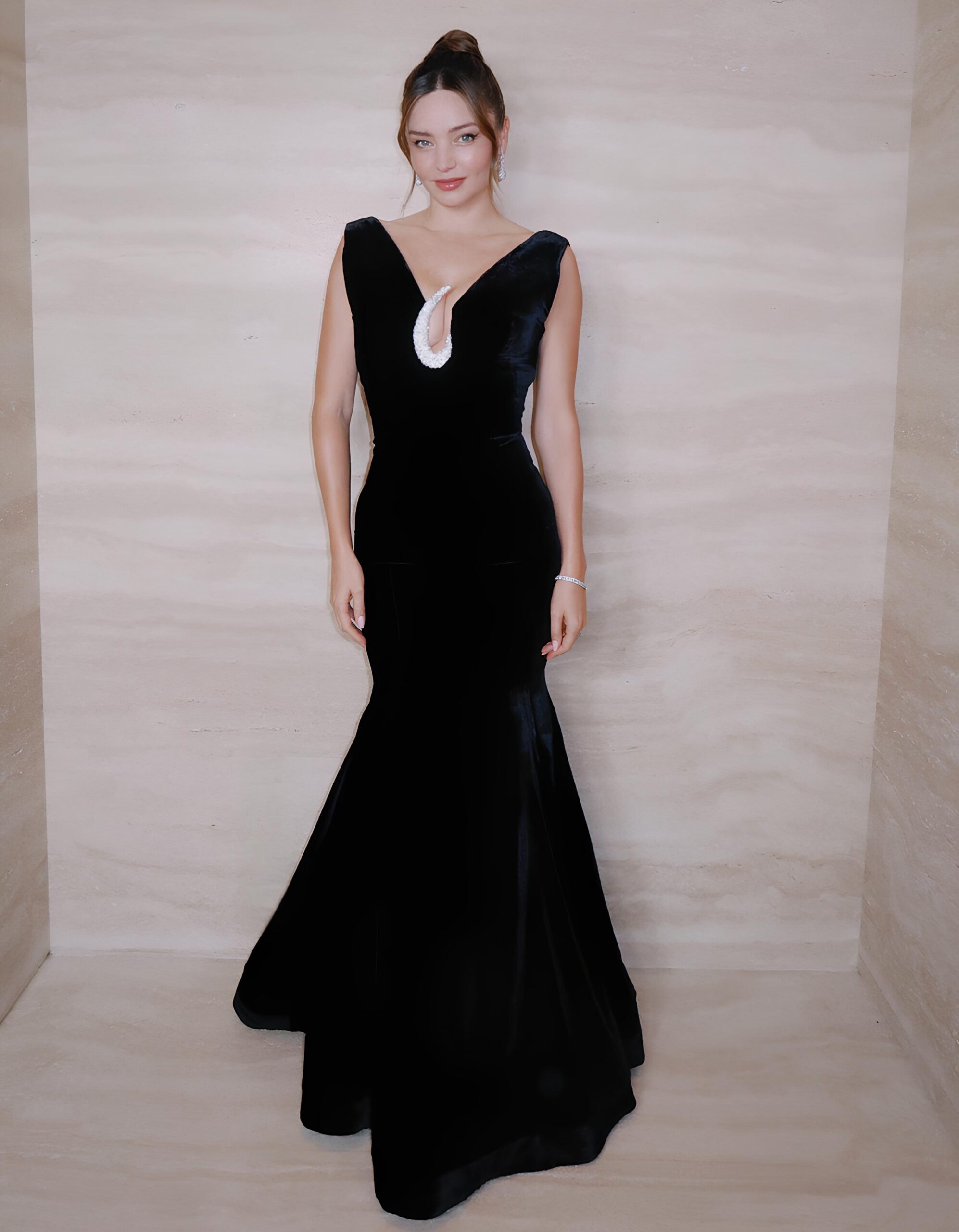 اختارت Miranda Kerr فستانًا أسود أنيقًا من Rachel Gilbert، مصنوعًا من قماش مخملي ناعم، يتميّز بقصّة ضيّقة تُبرز القوام وتنتهي بذيل خفيف يضيف لمسة راقية. يملك الفستان فتحة صدر على شكل حرف V مزينة بتفصيل براق مطرّز بسيط يمنحه توازنًا بين الجاذبية والنعومة