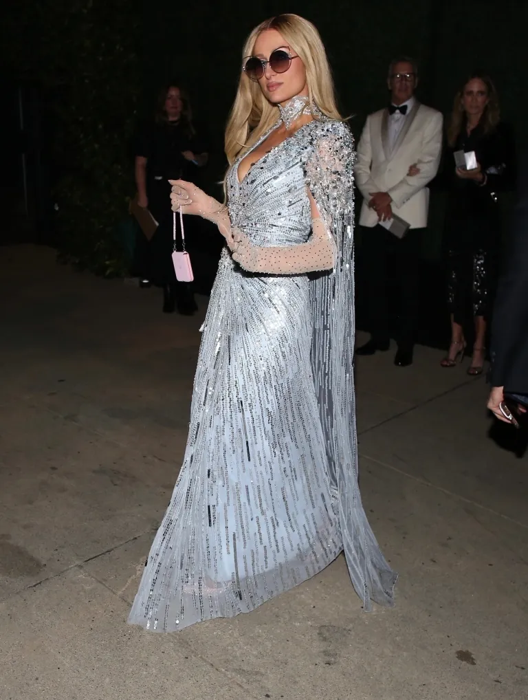 ظهرت Paris Hilton ترتدي فستانًا فضيًا لامعًا مع كاب طويل من توقيع Jenny Packham، ونسّقت إطلالتها مع نظارات شمسية من مجموعة SOJOS Palm Reverie Collection