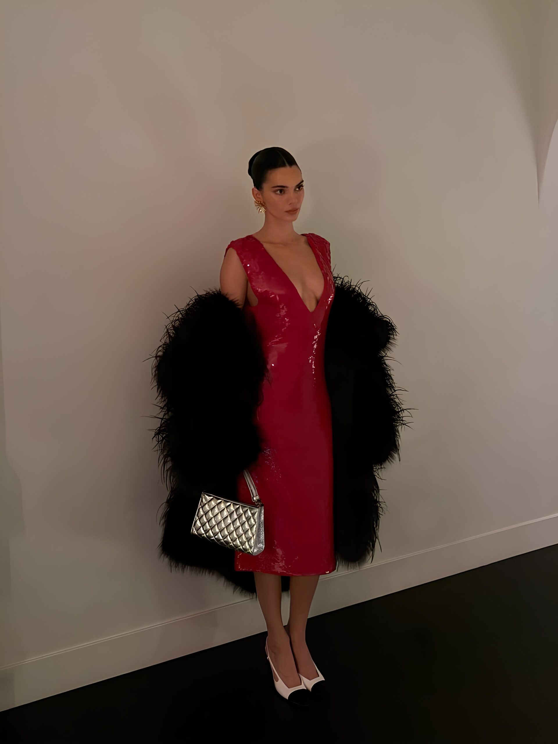 اختارت Kendall Jenner إطلالة تحتفي بالكلاسيكية الباريسية بلمسة جريئة من دار Chanel. الفستان الأحمر المرصّع بالترتر، بقصّة مستقيمة بلا أكمام وفتحة صدر عميقة، جاء متوازنًا بين الجرأة والرقي بطوله الذي ينسدل أسفل الركبة. ومعطف الريش الأسود الضخم أضفى دراما لافتة، بينما عزّزت الإطلالة مكانة كيندال كأيقونة للأناقة الهادئة ذات التأثير العالي.
