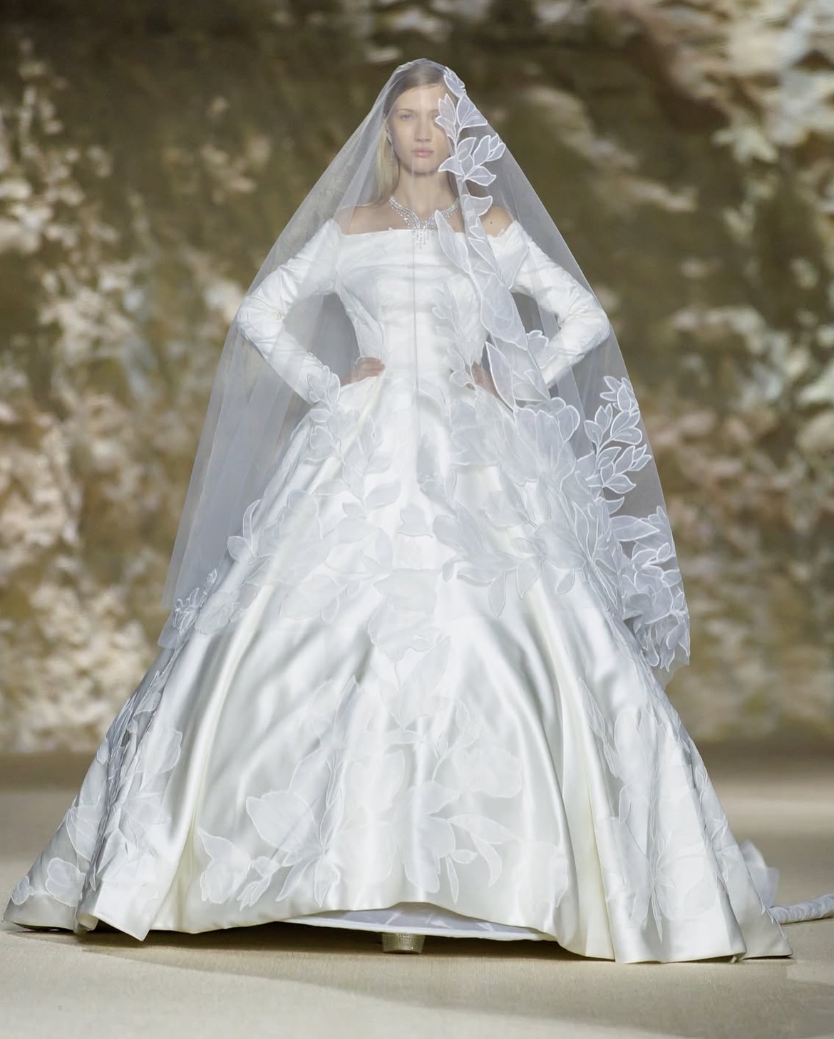تحوّلت بعض الورود إلى عناصر أساسية في الجزء العلوي للفستان، بتلات صغيرة متتابعة تشكّل سطحًا غنيًا، بينما يظل الجزء السفلي خفيفًا وشفافًا، ليكمل التوازن بين النعومة والأبعاد. كما أضافت الرسومات الزهرية على الطرحة الطويلة بعدًا بصريًا خفيفًا وراقي، ما يجعل الورود الصيحة الأساسية في هذه التصاميم.