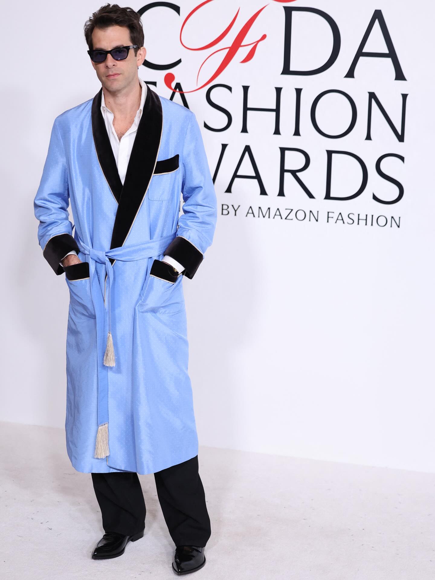 أطل Mark Ronson مرتديًا روبًا أزرق سماوي مزوّدًا بتفاصيل مخملية سوداء على الياقة والأكمام، مع حزام قماشي بشرّابات كريمية. نسّق الروب مع بنطال أسود وحذاء جلدي لامع، مضيفًا نظارات داكنة لمسة عصرية وجريئة تجمع بين الأناقة والاسترخاء، ما جعل الإطلالة مبتكرة وملفتة للأنظار على السجادة الحمراء.