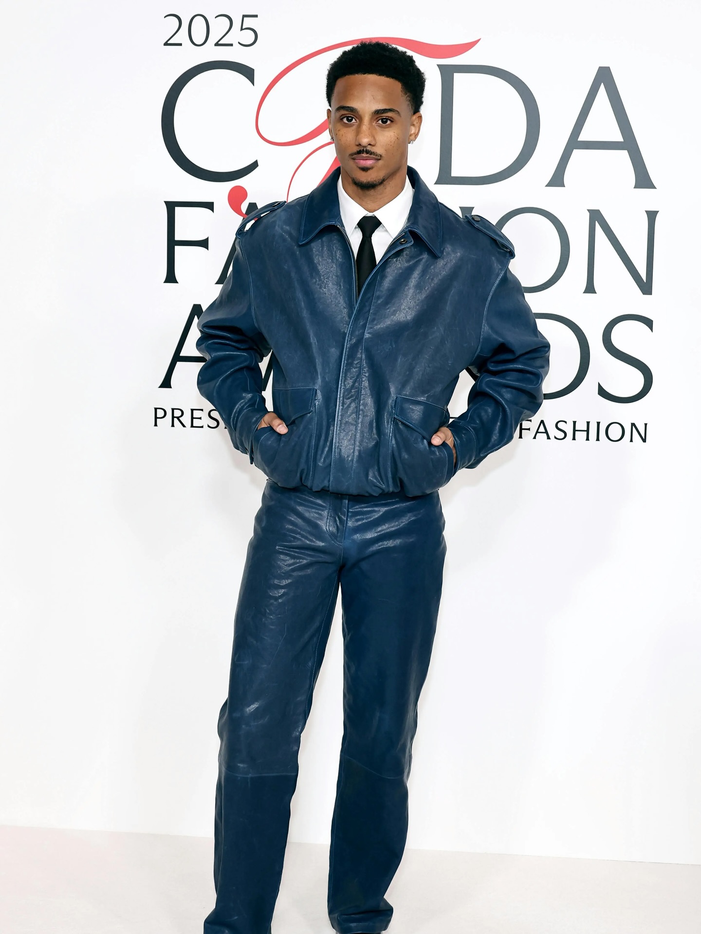 أطل Keith Powers بإطلالة عصرية مميزة من الجلد الأزرق الكامل، تتألف من سترة جلدية فضفاضة مستوحاة من أسلوب الطيارين الكلاسيكي، مزوّدة بجيبَين أماميين وياقة عريضة تضيف طابعًا قويًا وواثقًا. نسّقها مع بنطال جلدي مطابق، ما منح الإطلالة لمسة موحدة وجريئة، وأكمل المظهر بقميص أبيض وربطة عنق سوداء لإضفاء توازن أنيق بين الطابع الرسمي والكاجوال العصري.