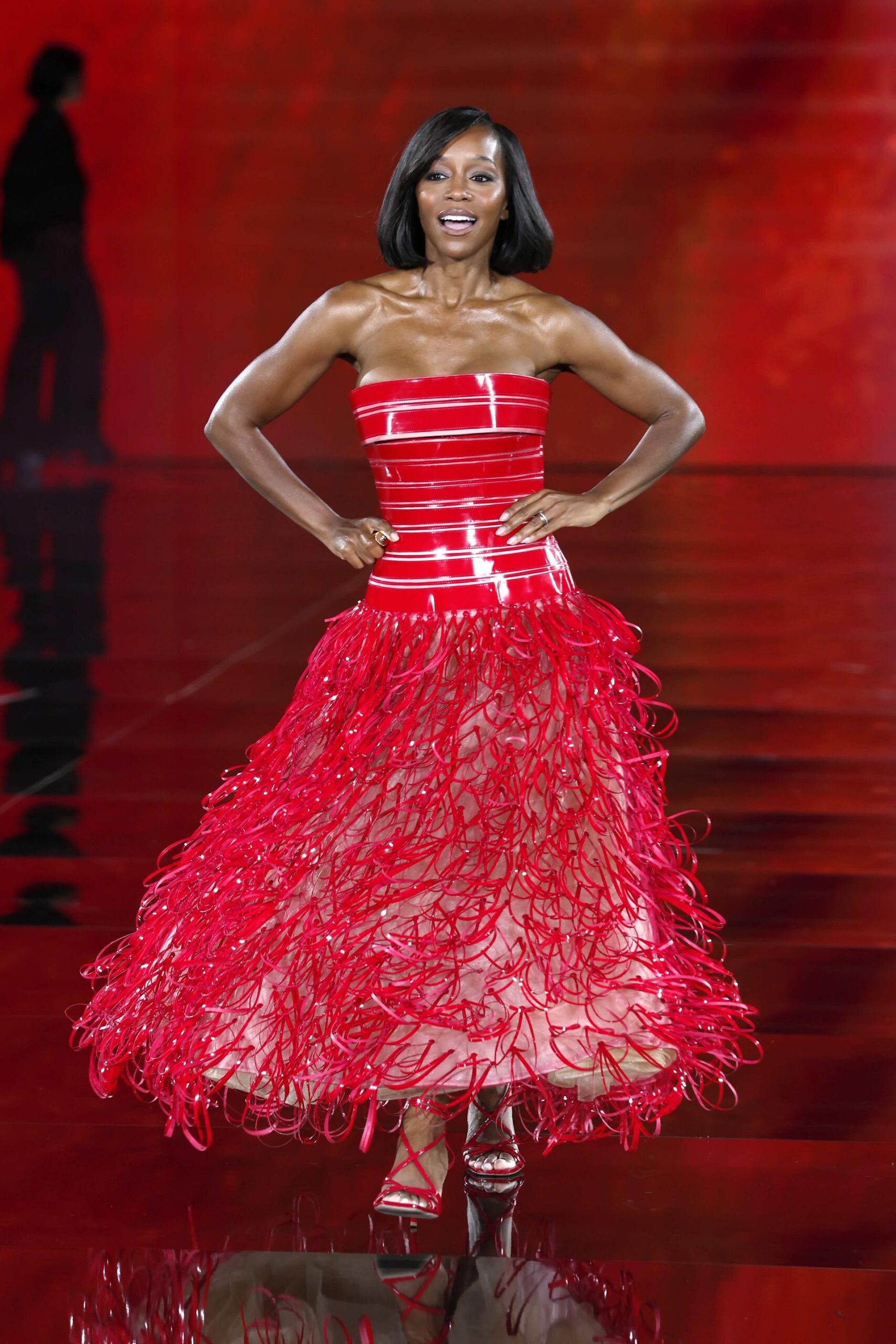 Aja Naomi King فتألقت بفستان أحمر من مجموعة المصمم جورج شقرا الهوت كوتور لخريف وشتاء 2025-2026، وتميز بصدرية مصممة بشرائط من الفينيل وتنورة تول واسعة مطرزة بترتر أحمر على هيئة دوائر