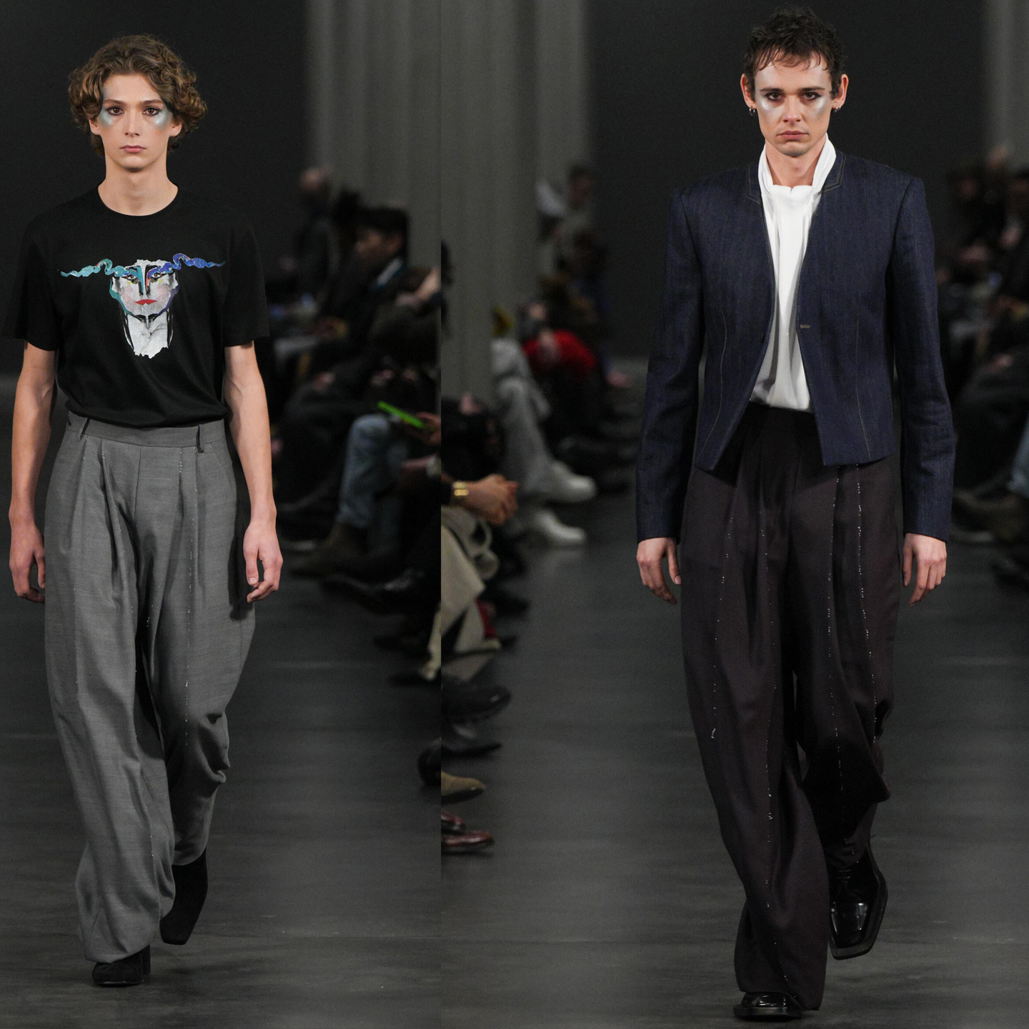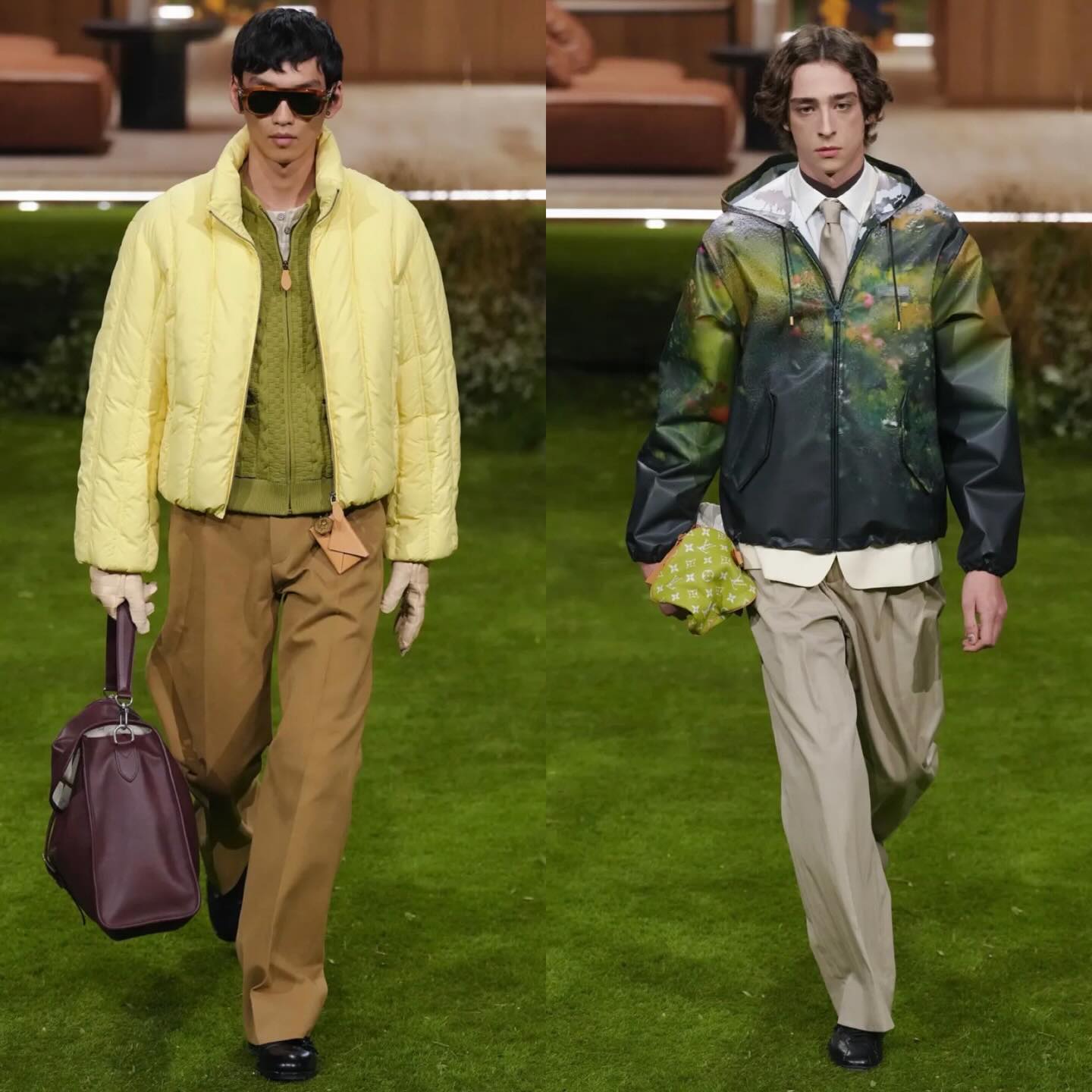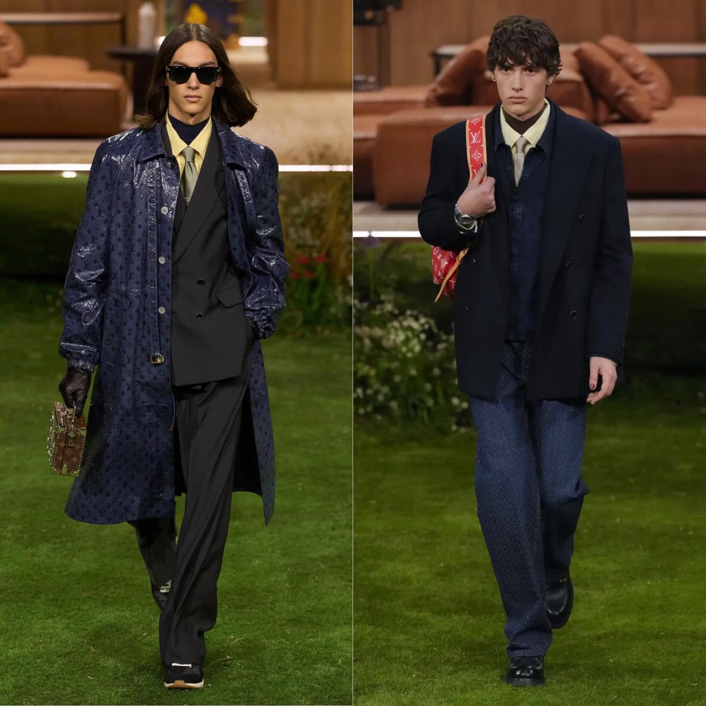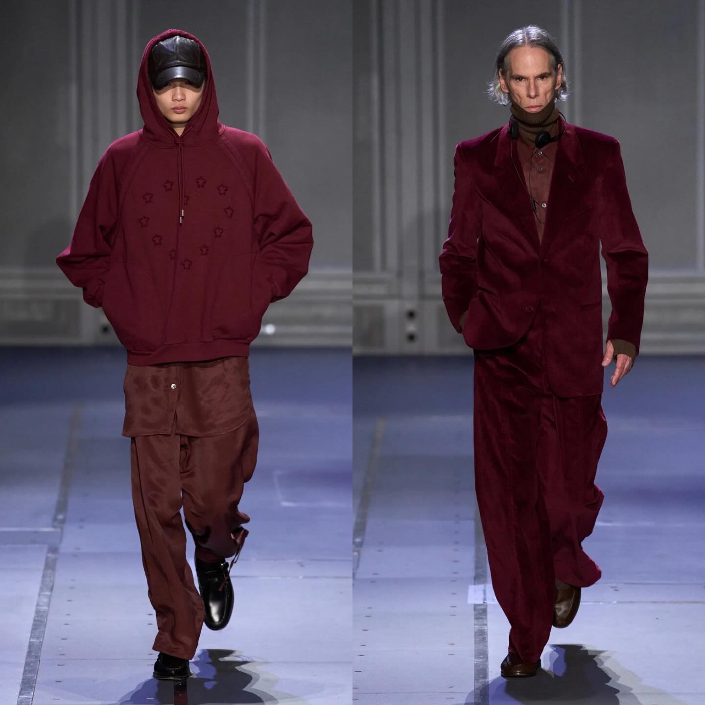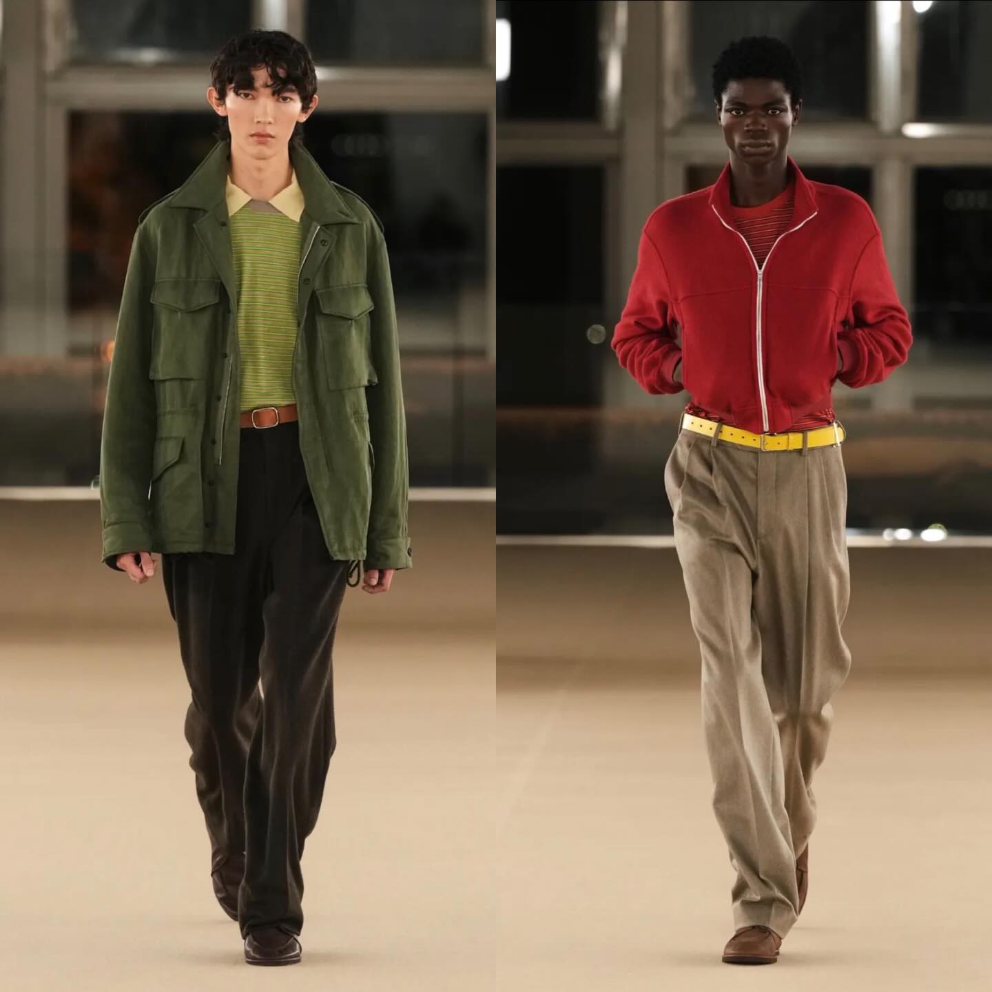 تميز العرض بتشكيلة أنيقة تجمع بين السترات المخملية، السترات الرسمية المصممة بدقة، والبلوشونات القماشية القصيرة التي تضيق عند الخصر، مع لمسات ألوان نابضة مثل الكرزي، البني، والأخضر. كما ضمّ العرض قطعًا مبتكرة بالتعاون مع الفنان الكندي Jeremy Shaw، ليقدّم تجربة فنية وموسيقية متكاملة تجمع بين اللون، النسيج، والحركة.