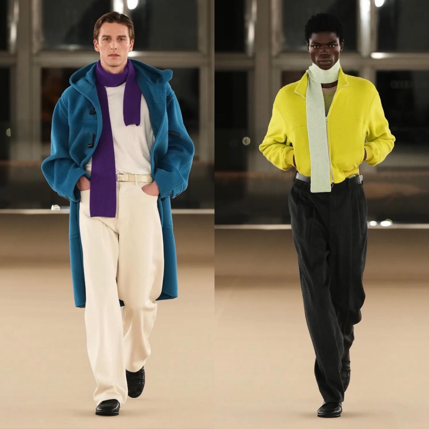 تميزت المجموعة بـ معاطف جلدية باللون الأزرق الملكي، كنتر أخضر نعناعي، وبناطيل وسترات صوفية حمراء زاهية، مع لمسات من الأصفر والبنفسجي على القمصان والمعاطف الهيكلية. ركّز المصمم على الإتقان في التفاصيل،