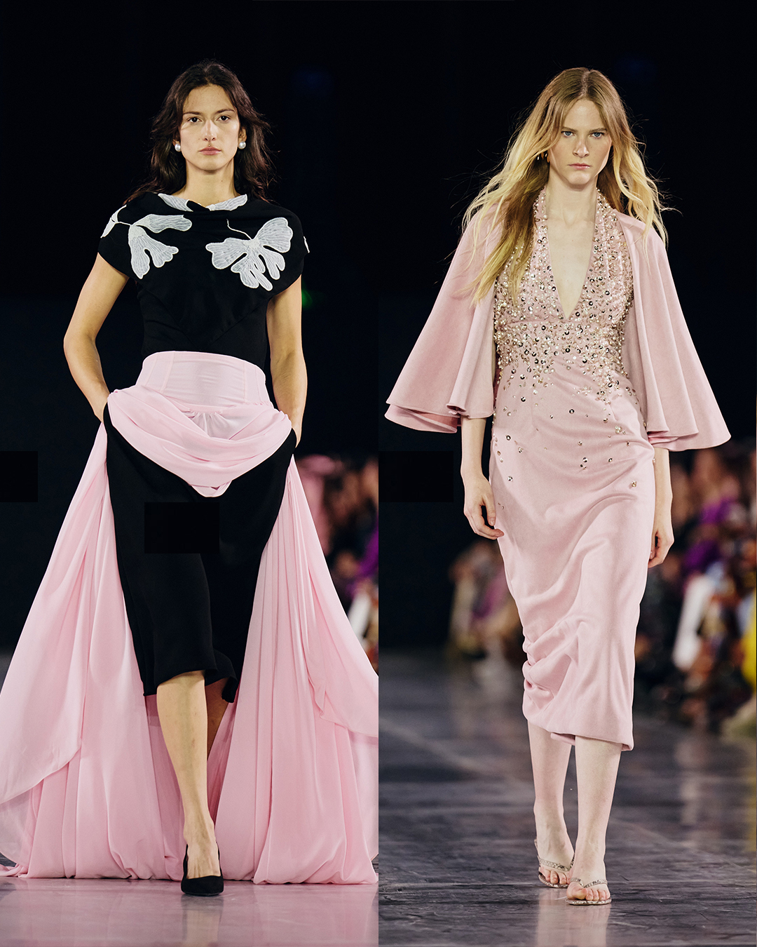 أما رزان العزوني فاختارت الرقة عنوانًا لمجموعتها التي مزجت بين الخامات الفاخرة والقصّات الانسيابية. لوحة الألوان اتسمت بالهدوء: الأبيض العاجي، الذهبي الباهت، والوردي الفاتح. شكّل التطريز العنصر الأبرز في التصاميم، بتفاصيله الناعمة والمتقنة التي زيّنت منطقة الصدر والأكتاف بلمسات برّاقة أضفت طابعًا ملكيًا أنيقًا. أما الفساتين الطويلة المصنوعة من خامات خفيفة، والمزيّنة بكابات قصيرة عند الأكتاف، فجسّدت أنوثة راقية تجمع بين الانسيابية والفخامة..