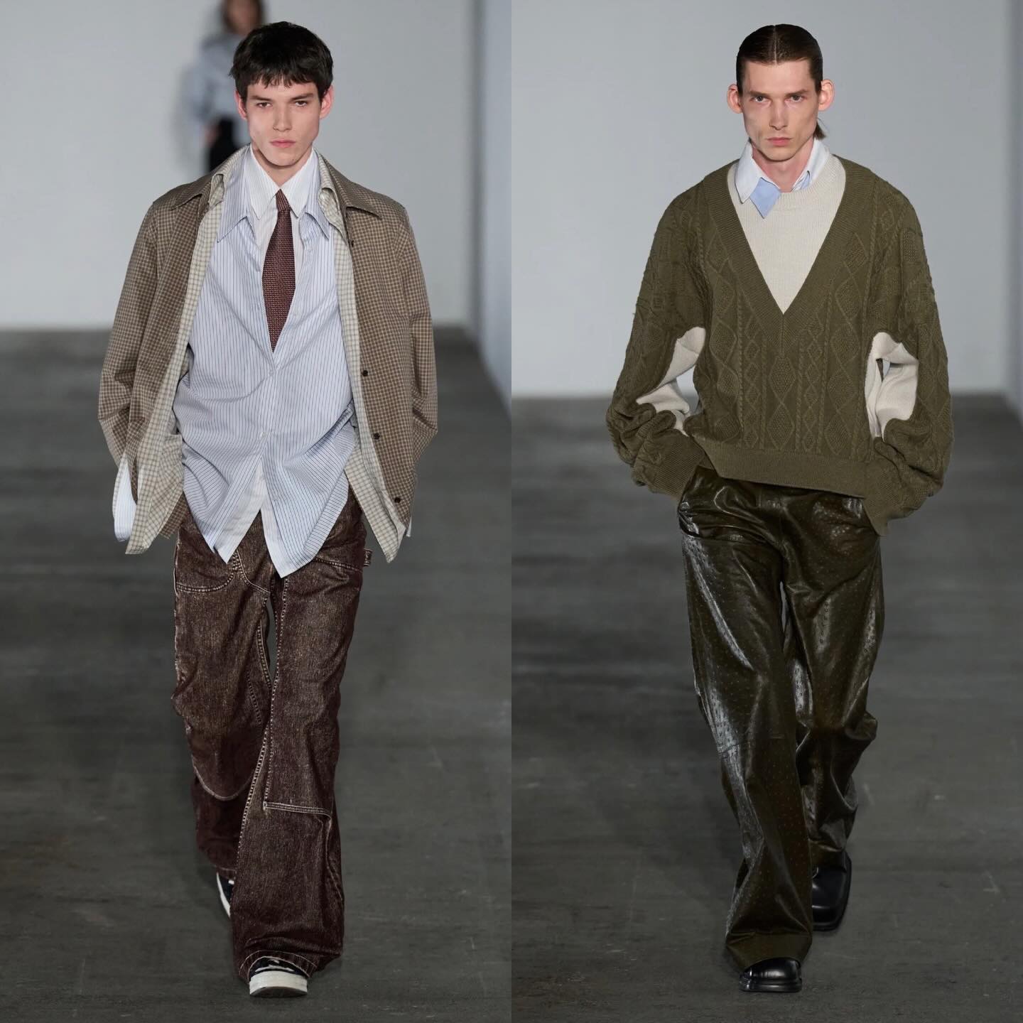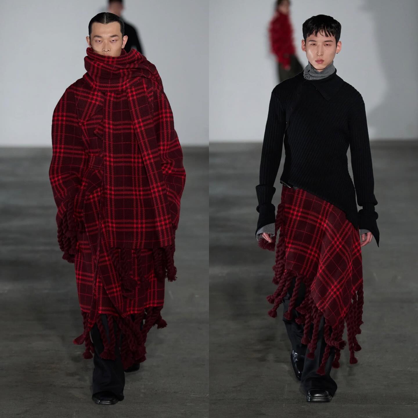 جاءت القطع داكنة يغلب عليها اللون الأسود مع لمسات من الأزرق والعنّابي، وقدّم بدلات بخطوط مريحة، سترات بجلود مرقّعة، بناطيل مستقيمة، وتنانير فوق السراويل بإيحاءات طقسية.