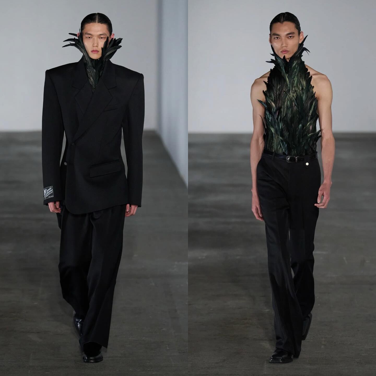 قدّم Feng Chen Wang في PMFW لخريف–شتاء 2026 مجموعة “Two Forces, One Motion” التي تمزج بين الخياطة المعمارية الدقيقة والمواد الثقيلة مثل الصوف والجلد مع أقمشة مفككة ولمسات يدوية، لتجسّد فكرة التوازن بين قوتين متناقضتين تعملان معًا. تحمل القطع تأثيرات خامة غير مكتملة ورموزًا فلسفية، مقدّمة رؤية معاصرة تجمع بين النظام والعفوية، التقليد والتجريب في عالم الموضة.