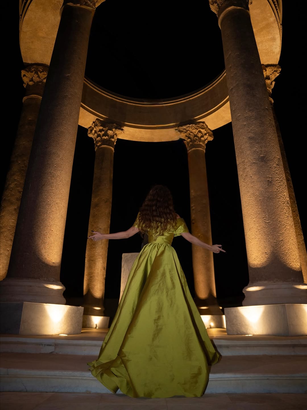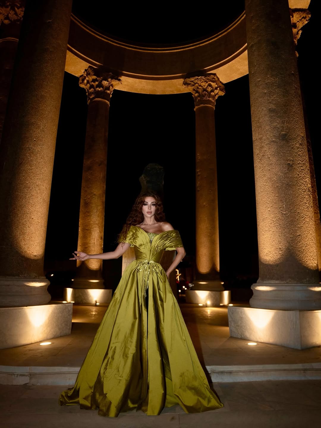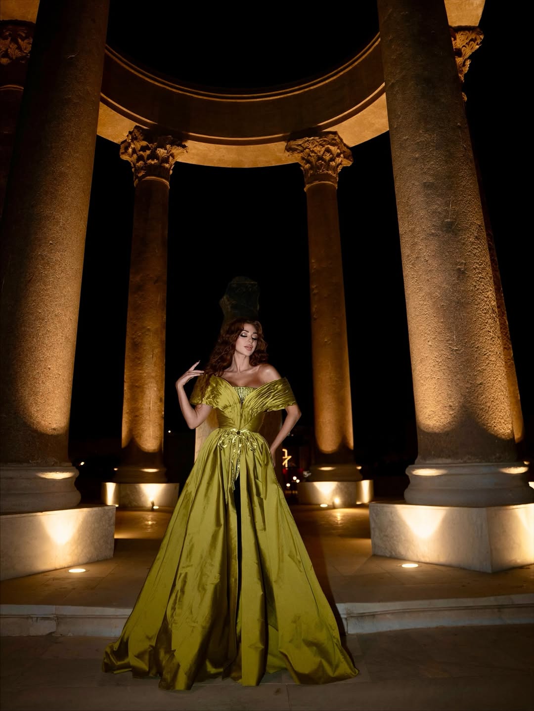 اختيار اللون كان موفّقاً، إذ انسجم الأخضر الحيوي مع الإضاءة المعمارية للمتحف وأجواء الأمسية، مضيفاً لمسة من الحيوية على مشهد فني اتسم بالرصانة والتميز. أما تسريحة الشعر والمكياج فجاءا طبيعيين بتدرجات دافئة عززت من الطابع الأنثوي للإطلالة.