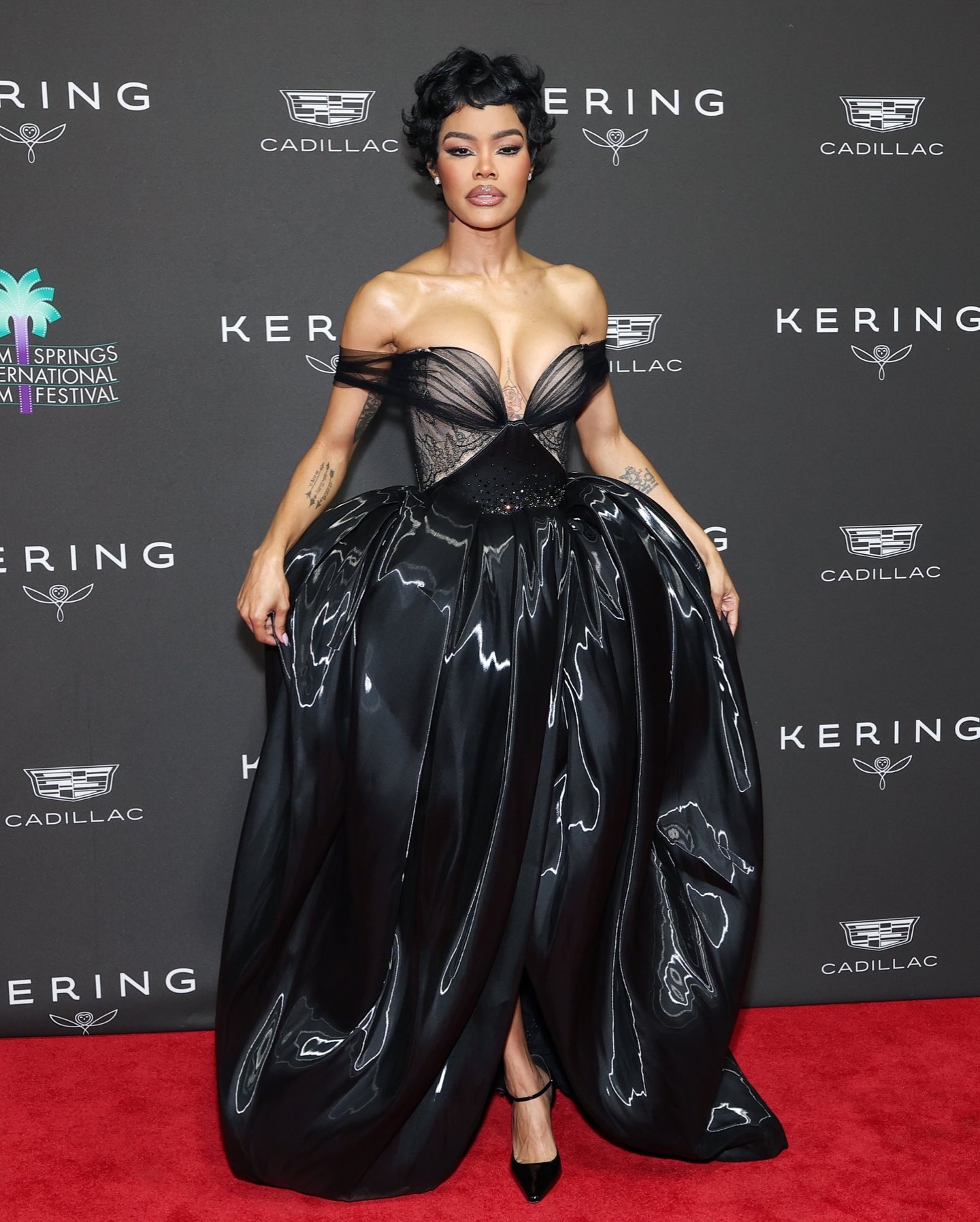 اختارت Teyana Taylor فستانًا أسود من Miss Sohee SS25 Haute Couture بياقة off-shoulder وكورسيه وتنورة منحوتة. وبالتالي، يبرز التصميم شخصية Teyana المتميزة ويجمع بين الجرأة والأناقة المسرحية. كما حافظ الفستان على طابعه العصري دون مبالغة.