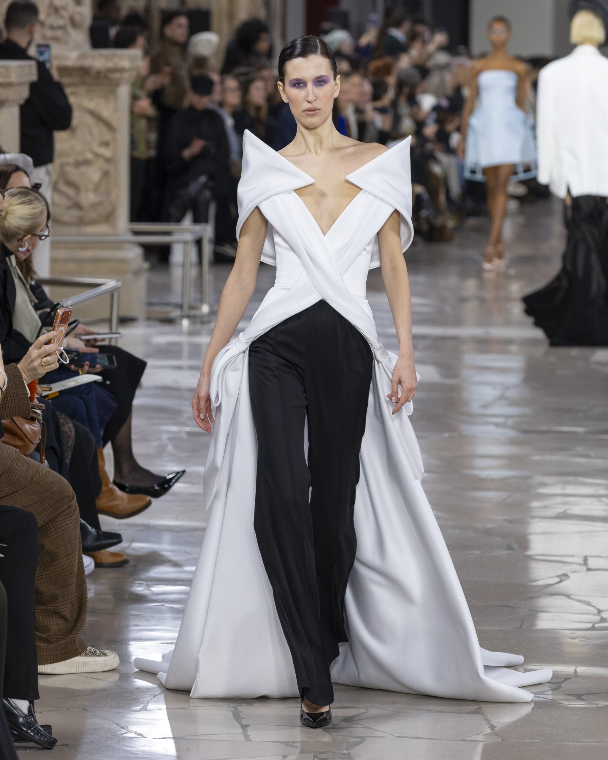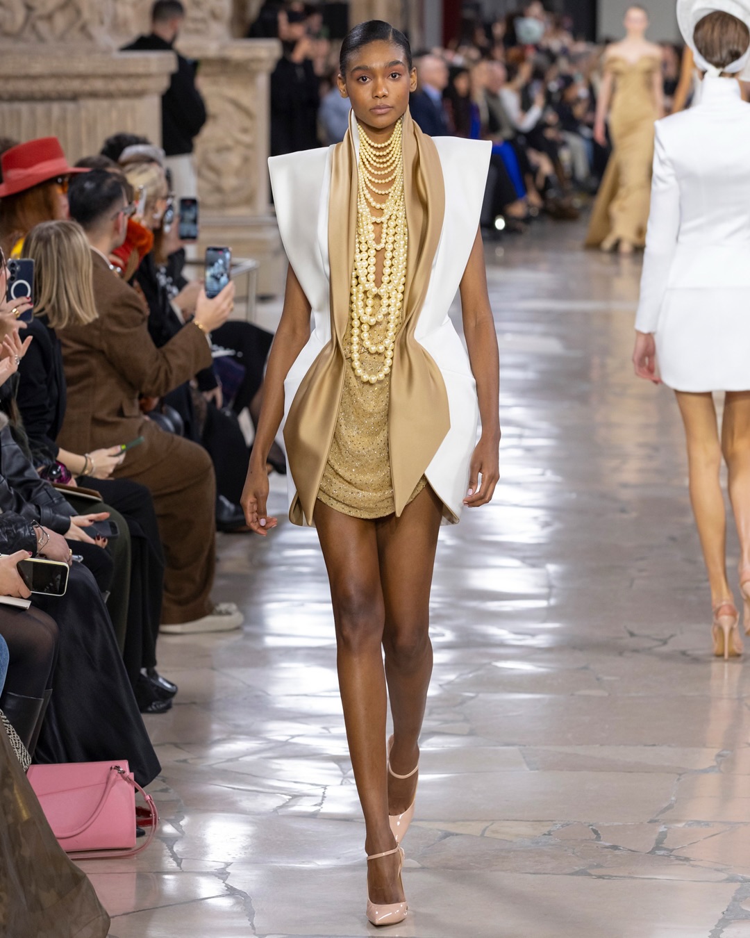 أما الأبيض والأسود، فحضرا بقوة في تصاميم أيقونية شكّلت لحظات بصرية لافتة، مؤكدة أن التباين الكلاسيكي لا يزال عنواناً للفخامة الخالدة.