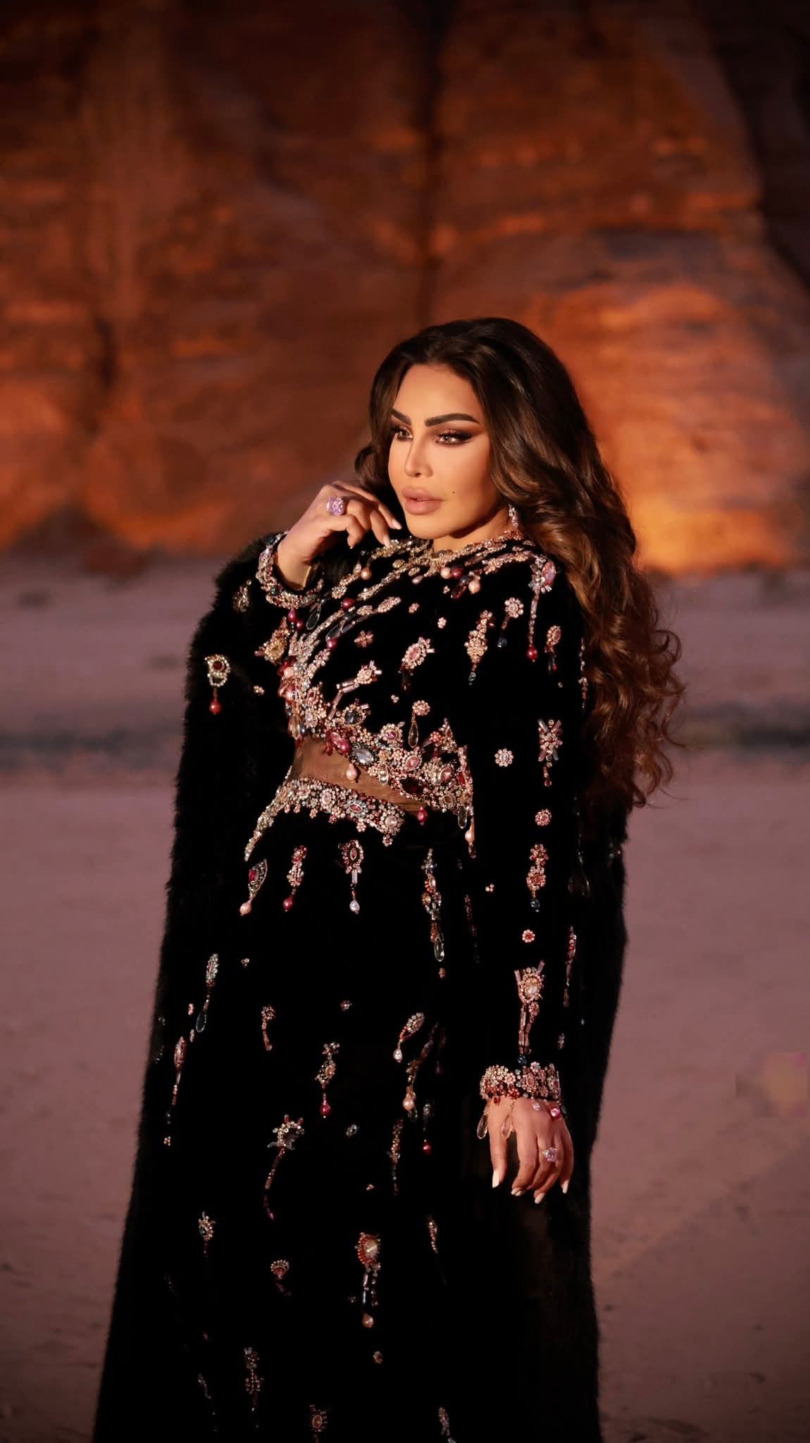 النجمة اللبنانية إليسا أطلت بفستان سهرة طويل من المخمل الأحمر الداكن من تصميم المصمم اللبناني نيكولا جبران. الفستان مزين بثنيات تنساب بانسيابية تحاكي حركة الرمال، مع تصميم كورسيه يحدد الخصر تدريجيًا، وينتهي بتنورة تتوسع بلطف نحو الأسفل. أضاف القفاز الطويل من نفس القماش والأكسسوارات الماسية توازنًا مثاليًا بين الفخامة والبساطة، فيما أكملت الإطلالة بشعر مموج متدفق خلف الظهر، ليكتمل المشهد الراقي وسط الطبيعة الصحراوية الساحرة.