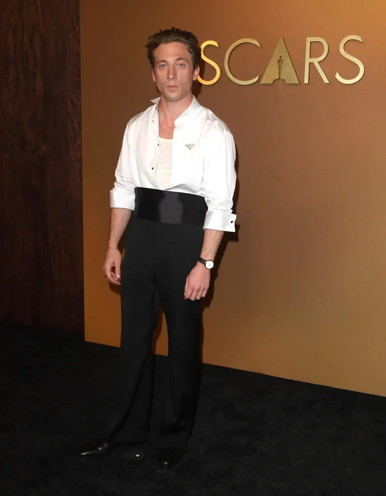 جيرمي ألين وايت اعتمد إطلالة راقية تجمع بين الكلاسيكية واللمسة العصرية من توقيع Louis Vuitton، بقميص أبيض بأزرار مفتوحة وأكمام مطوية، وبنطال أسود عالي الخصر مزين بحزام عريض يضفي طابعًا مبتكرًا. أكملت الإطلالة بساعه كلاسيك وحذاء اسود أنيق منحه توازنًا وأناقة مميزة.