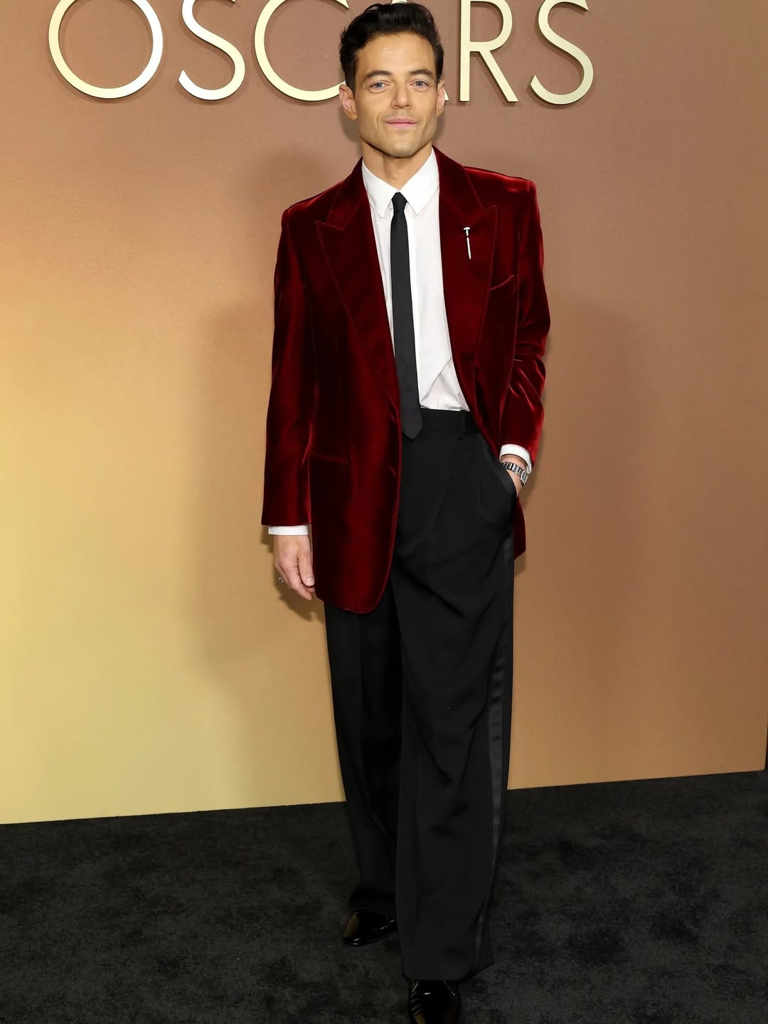 ظهر رامي مالك بإطلالة لافتة مرتديًا تصميماً أنيقًا من Saint Laurent جمع بين جاكيت مخملي باللون الأحمر الداكن وبنطال أسود يمنح حضورًا كلاسيكيًا راقيًا. وأكمل الممثل إطلالته بلمسة من مجوهرات Cartier التي أضافت لمسه انيقه إلى مظهره.