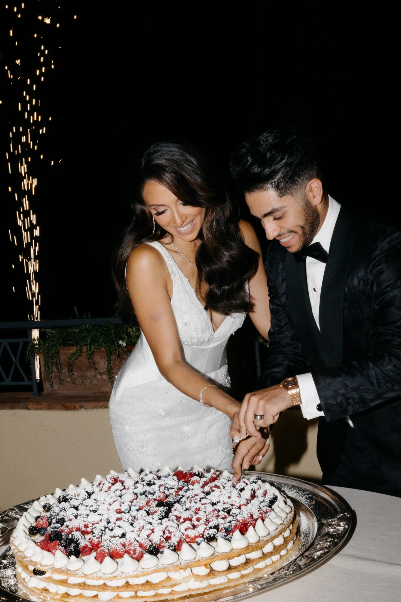 أما العريس فاختار توكسيدو كلاسيكيًا من Zegna مع حذاء من Christian Louboutin وساعة Audemars Piguet Royal Oak.