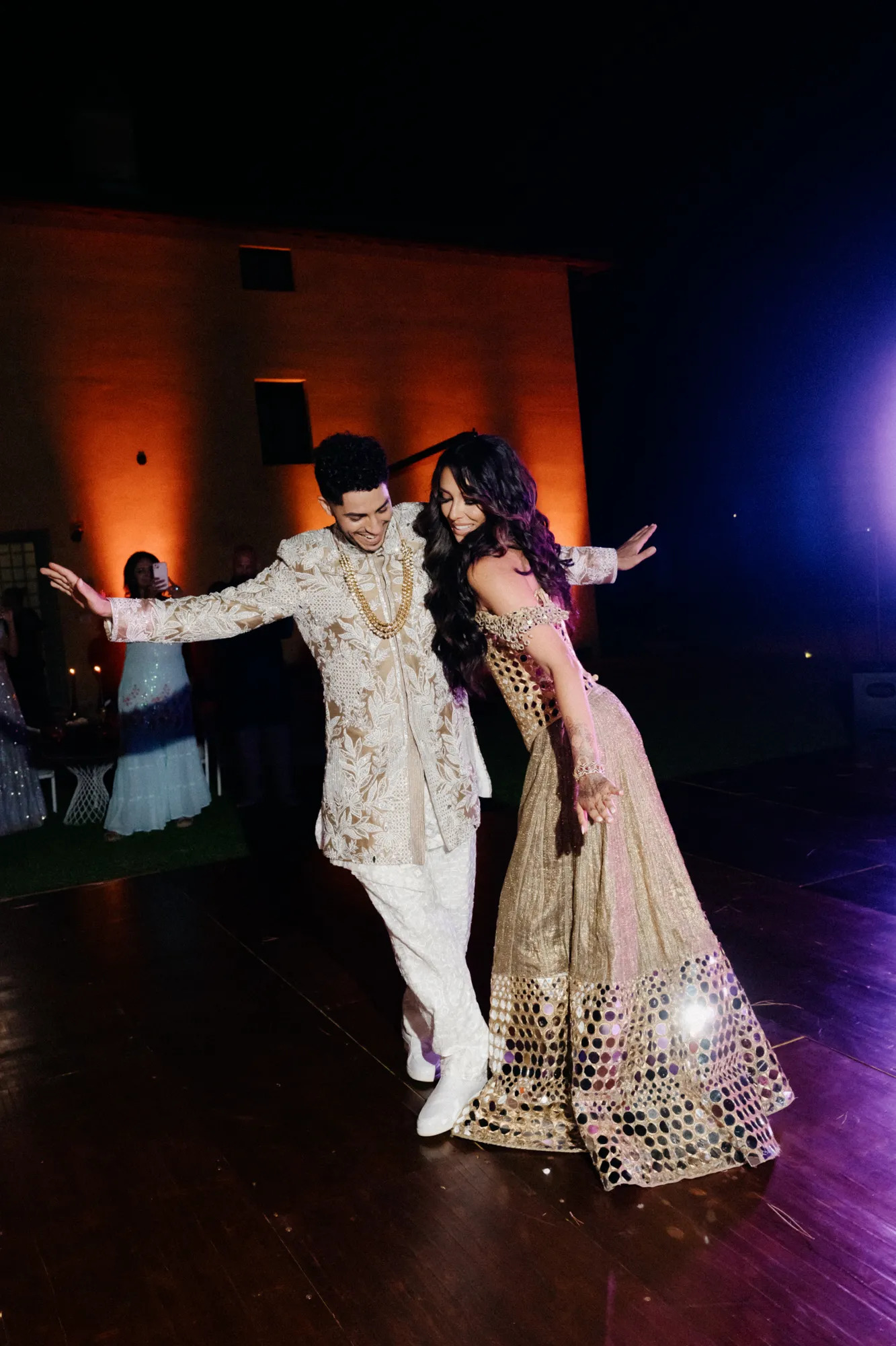 وفي حفل الاستقبال على طراز sangeet، بدلت Emily Shah إطلالتها إلى فستان ذهبي من Shona Joy وسط أجواء موسيقية مميزة.