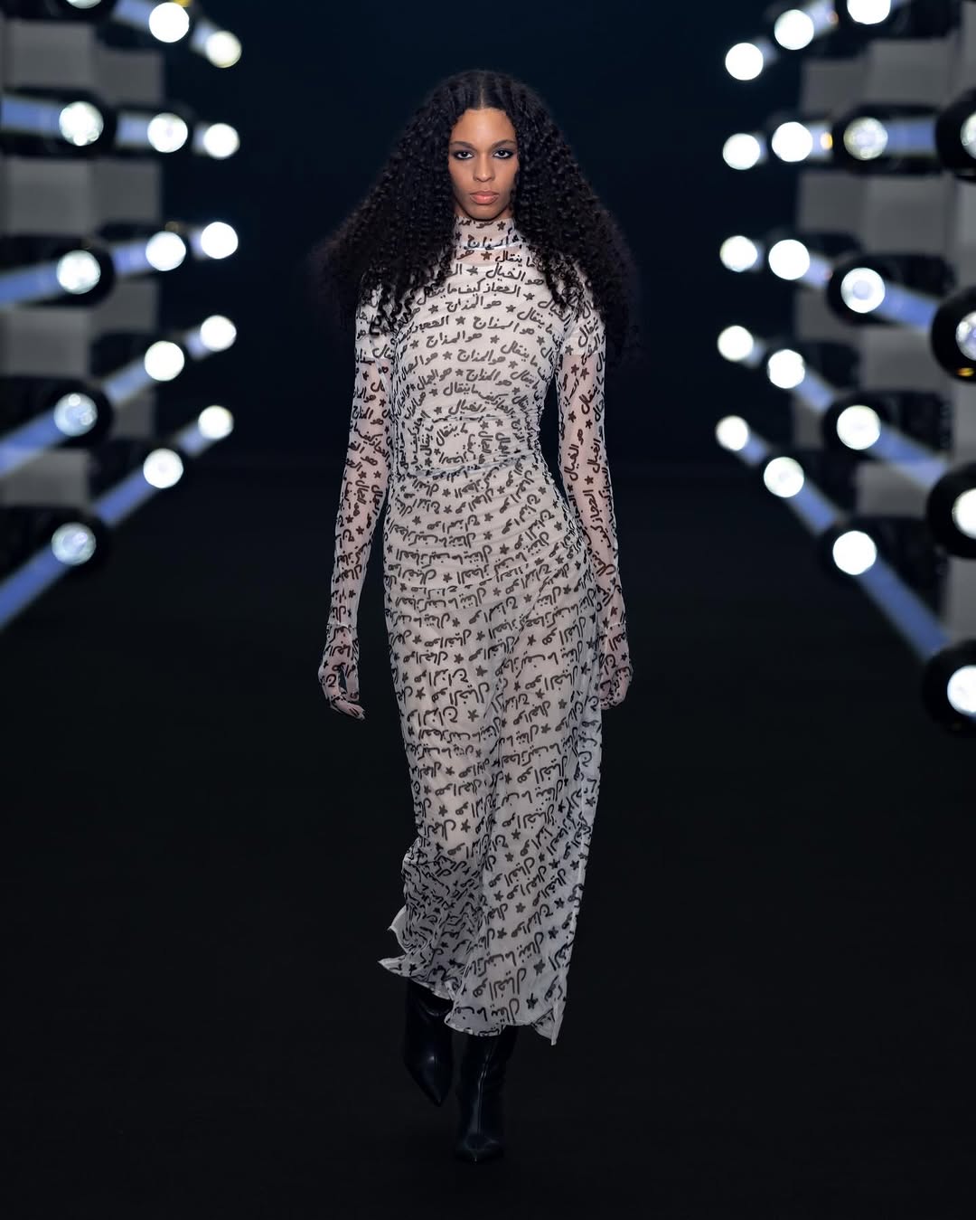 لم يكن تصميم «مجهولة» قطعة تقليدية، بل عملًا سرديًا مكتوبًا على القماش. قصيدة كاملة خُطّت بأسلوب فني، جمعت مفردات تنتمي إلى الحجاز، والخيال، والغزل، والجمال، والواقع. كلمات صُمّمت لتكون جزءًا من نسيج الفستان، لا تفصيلًا زخرفيًا، ما منح الإطلالة عمقًا ثقافيًا وشعريًا واضحًا.