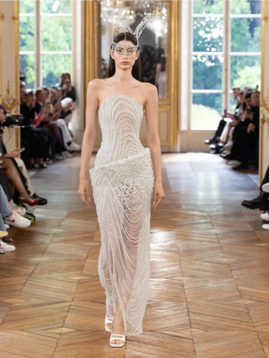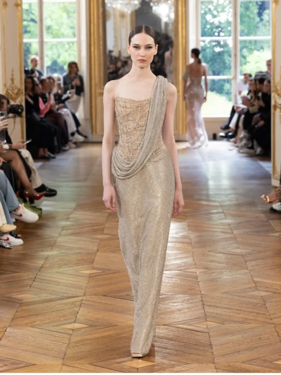 في هذا العرض، تجسّدت الفكرة عبر تطريزات ثلاثية الأبعاد وقصّات منحوتة تعزز حضور الجسد. كما ساهمت الأقمشة الشفافة والمخمل المنقوش في بناء مشهد بصري يجمع بين الجرأة والرقي.