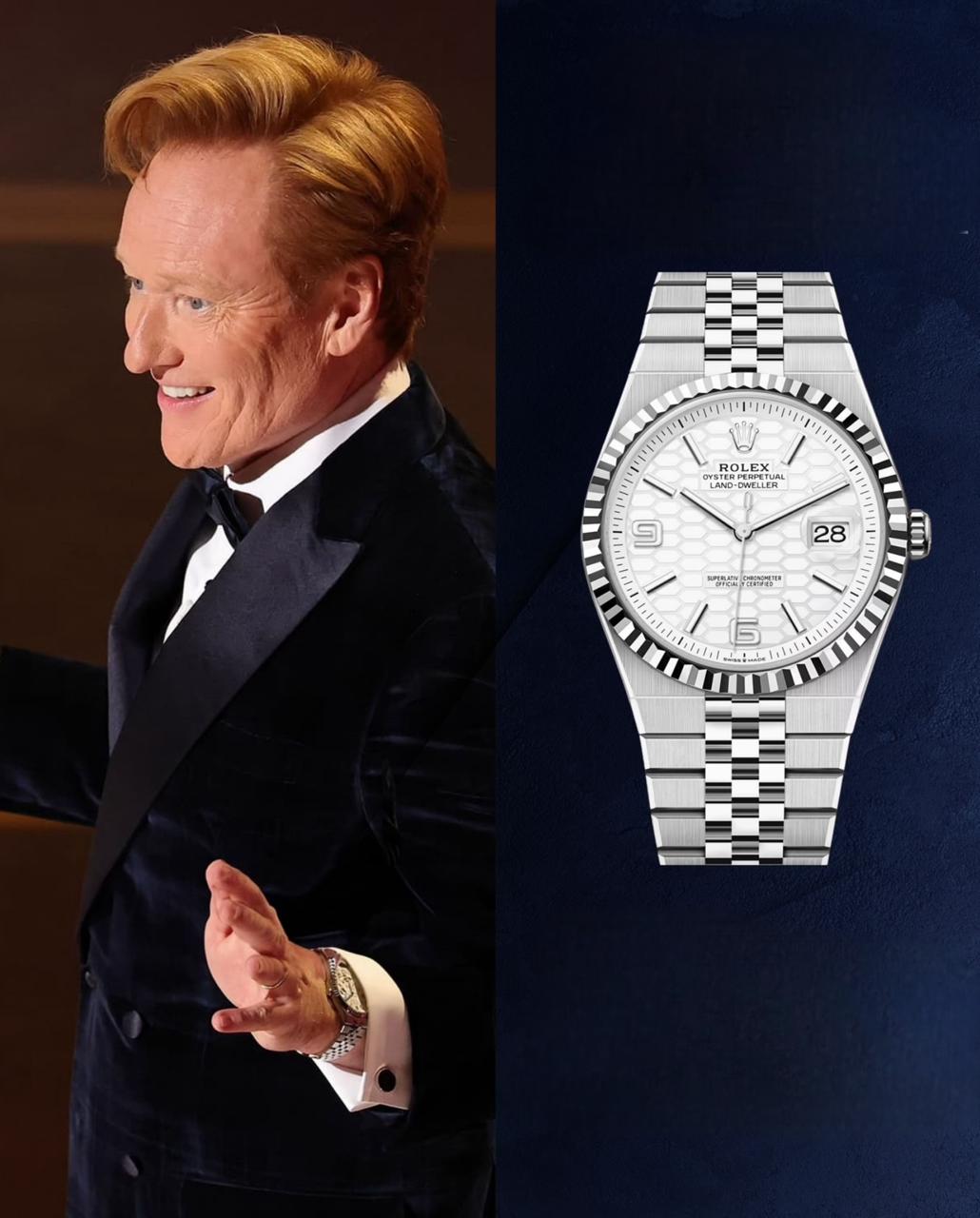 كما اختار مقدم الحفل كونان أوبراين ساعة Rolex Oyster Perpetual Land-Dweller، أحدث إصدارات الدار، بتصميم يجمع بين الابتكار والتطور التقني والفخامة، ما جعلها قطعة محورية في إطلالته.