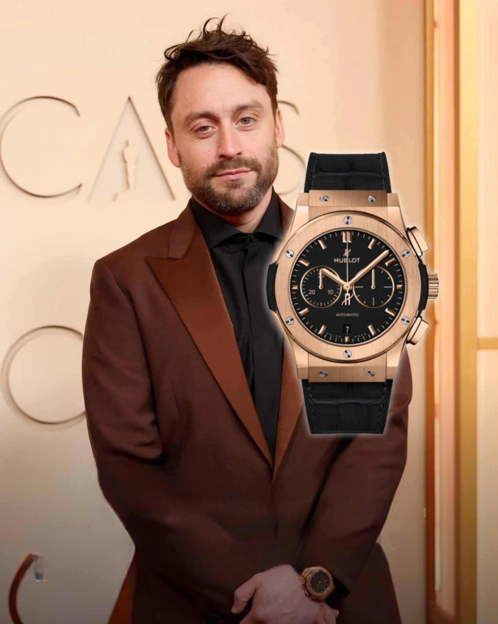 بينما أطل كيران كلكين بساعة Hublot Classic Fusion Chronograph King Gold التي جمعت بين الحداثة والتقنيات المتقدمة، لتعكس شخصيته العصرية.