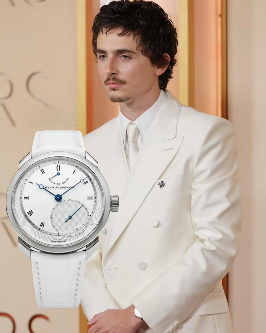 أما تيموثي شالاميه فقد ظهر بساعة Urban Jürgensen UJ-2 المصنوعة يدويًا، والتي تبرز التفاصيل الدقيقة والميناء المزخرف، لتكون رمزًا للحرفية الفنية الفاخرة وذوقه الرفيع.