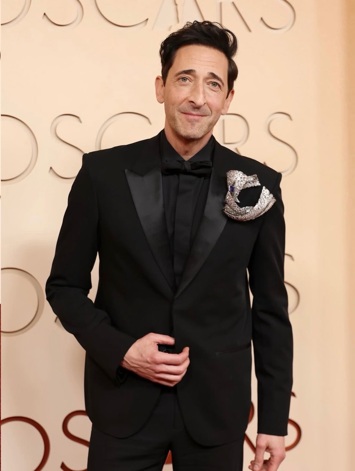 بينما خطف أدريان برودي الأنظار ببروش Ulysses من تصميم Elsa Jin، مع حجر ياقوت أزرق ضخم محاط بأكثر من 1,200 قطعة ألماس، ليصبح الإكسسوار قطعة فنية بحد ذاته.