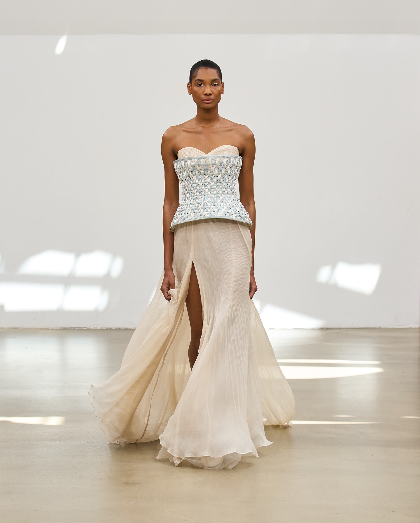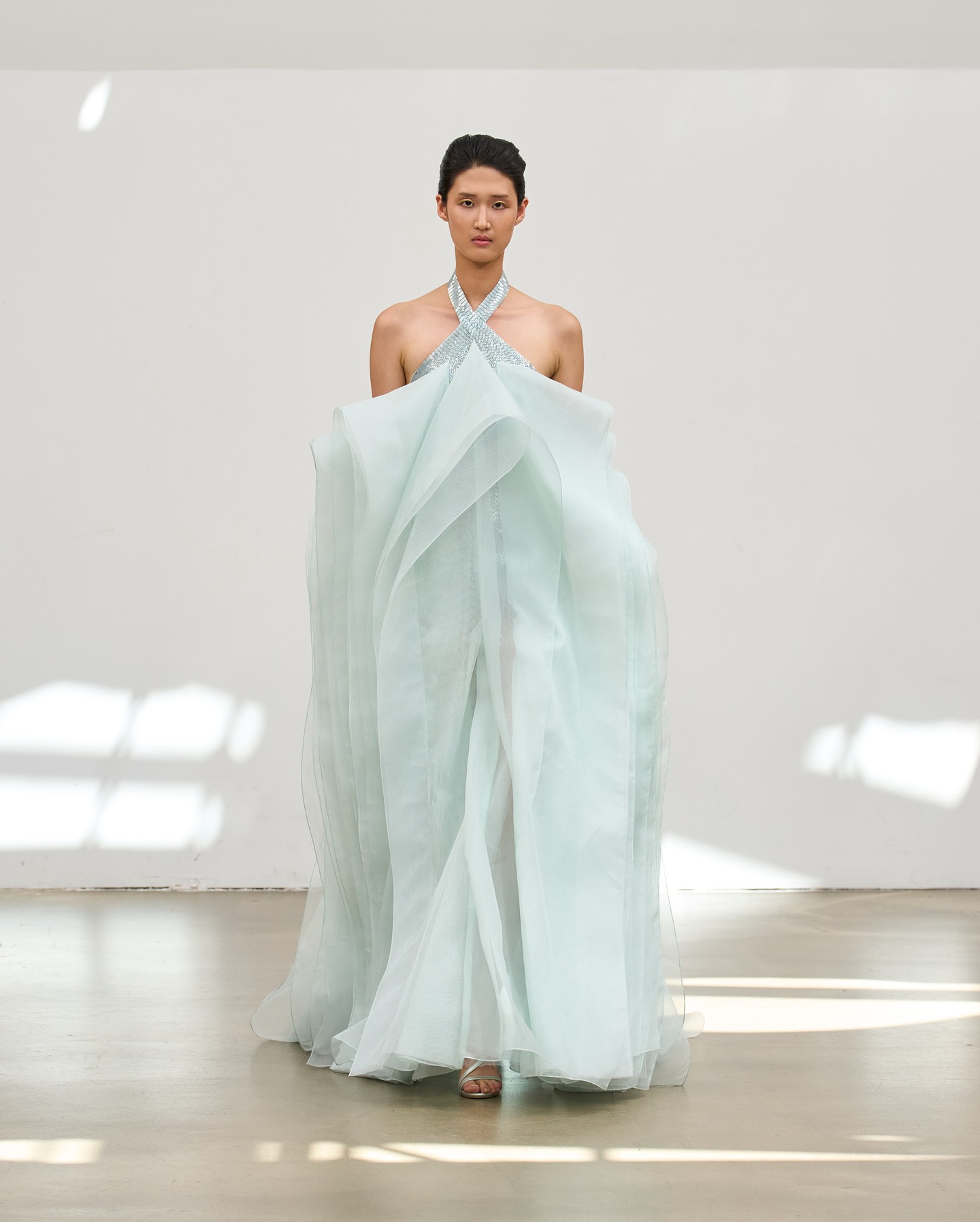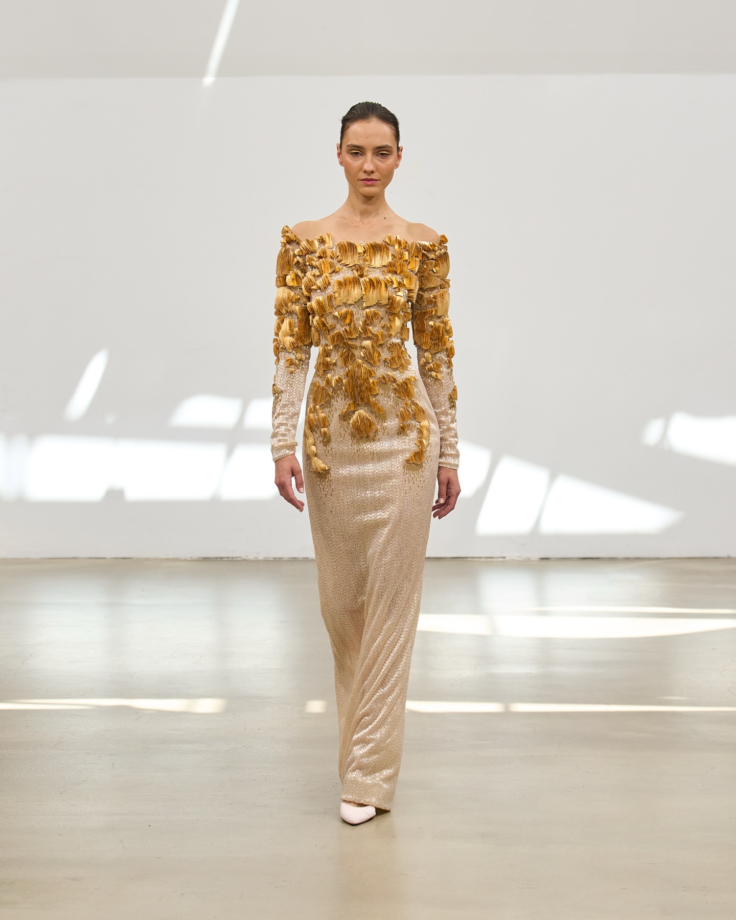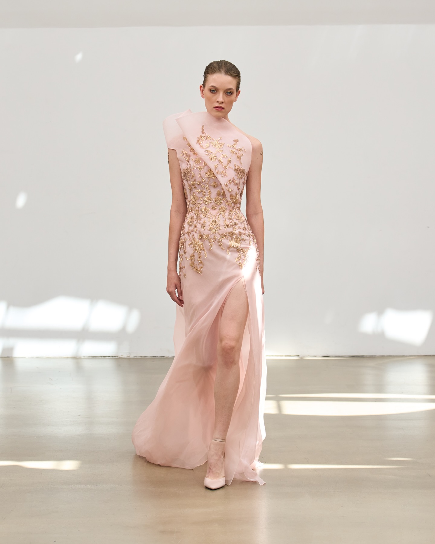 الأقمشة انسدلت بخفة بين الحرير والأورغانزا، تحمل معها نعومة لا تُقاوم، بينما أضافت التطريزات اليدوية روحًا خاصة لكل فستان، وكأنها تهمس بسرّها مع كل خطوة.