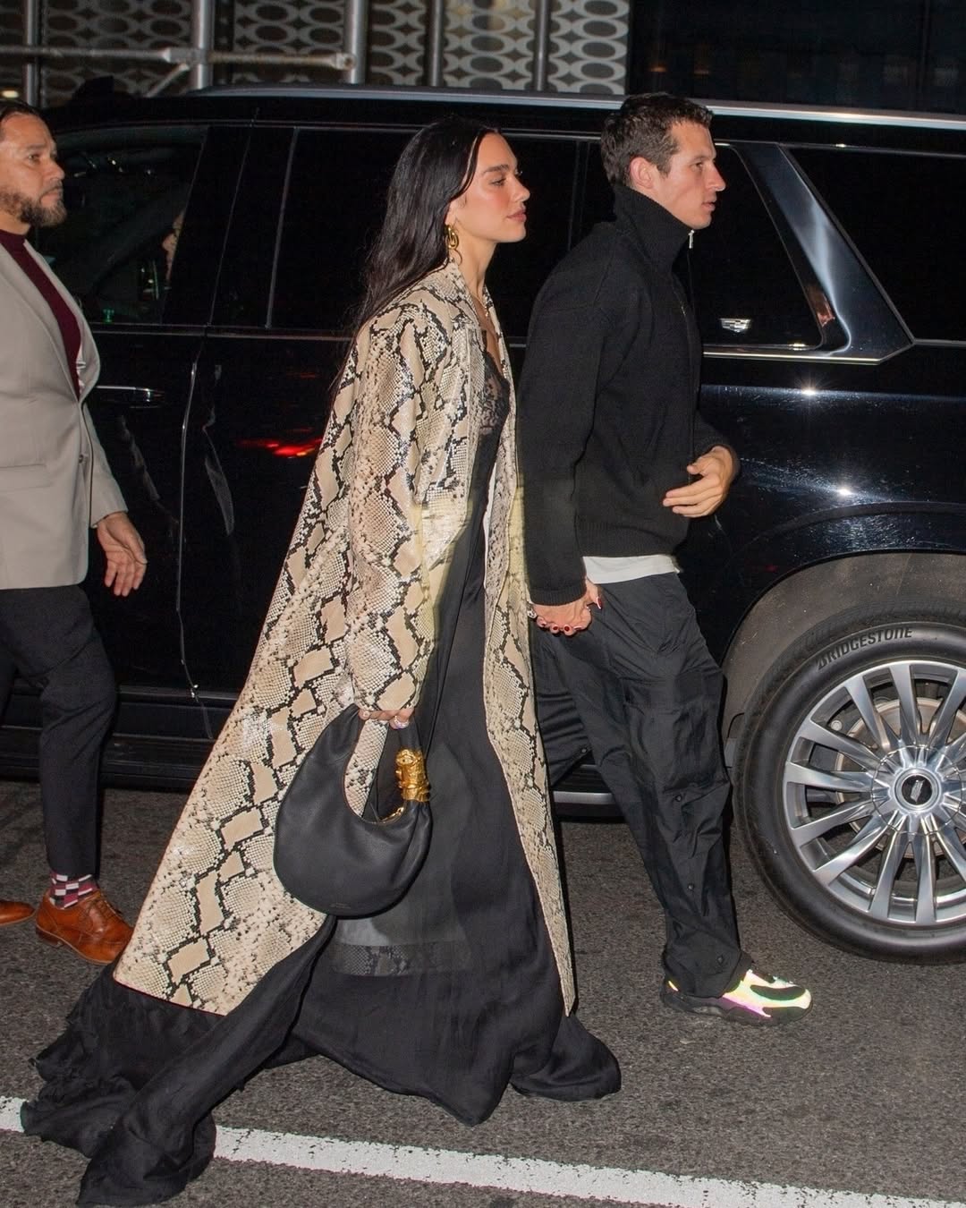في نيويورك، خطفت Dua Lipa الأنظار خلال حفل إطلاق ألبوم روزاليا الجديد “LUX”، حيث تألقت بمعطف طويل بنقشة الثعبان فوق إطلالة سوداء أنيقة، فيما رافقها خطيبها الممثل Callum Turner بإطلالة كلاسيكية من الجلد والكارديغان باللون الأسود، ليظهرا كثنائي لافت بأناقتهما الهادئة وتناسقهما الواضح.