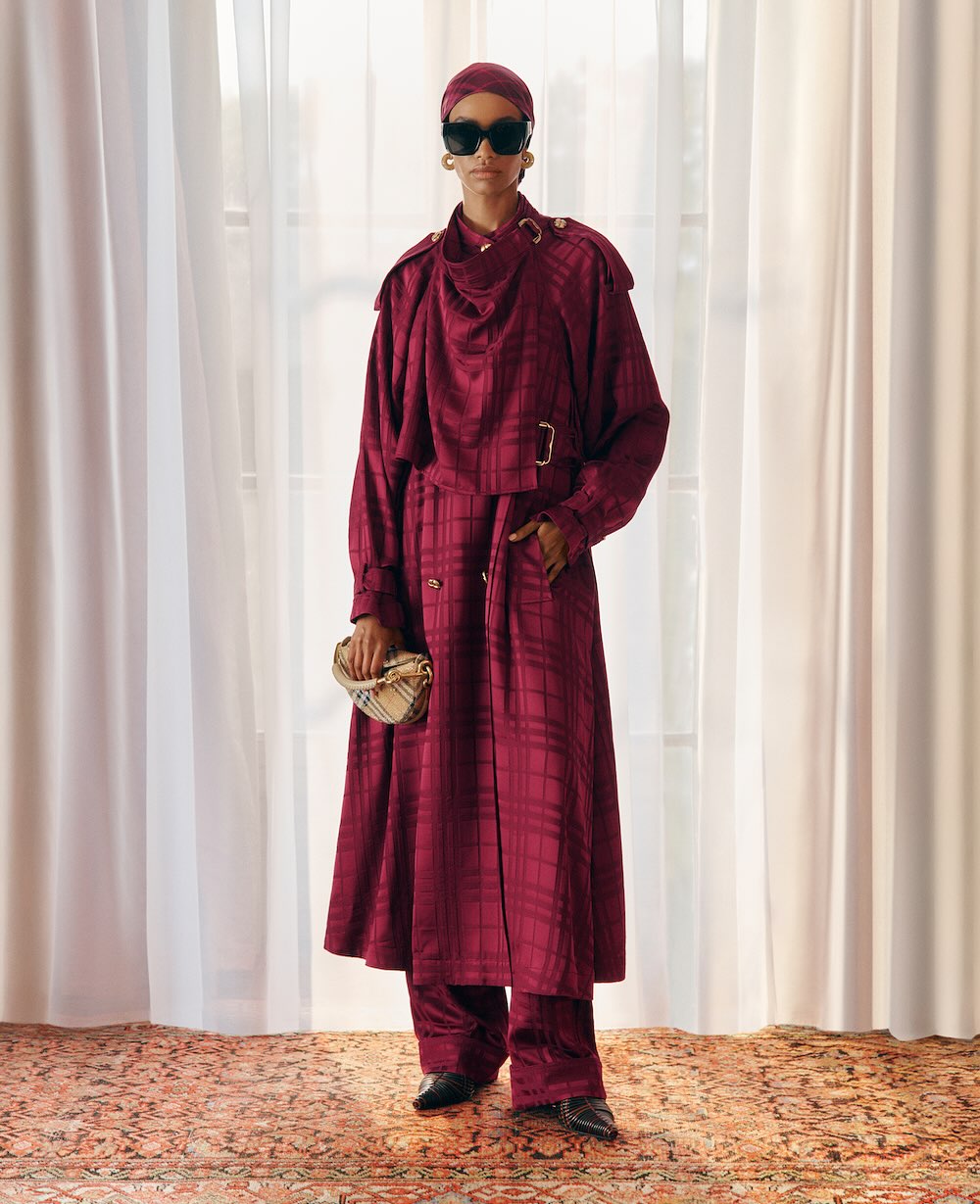 ركزت Burberry على خطوطها الكلاسيكية بألوان الأحمر الناعم والحيادية الدافئة، مع أحذية Sloane المميزة والقبعات الشمسية المزخرفة بالكريستال، ما يعكس مزيجًا متوازنًا بين الراحة والفخامة البسيطة.