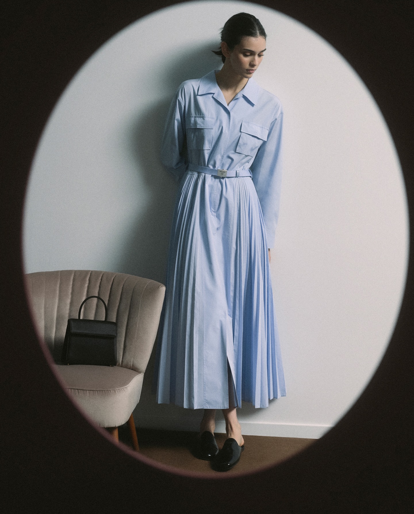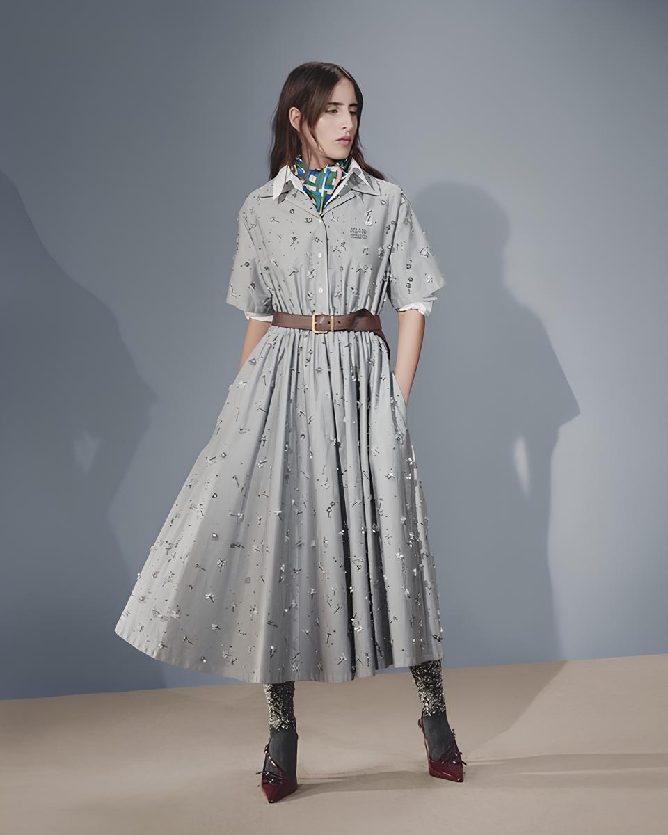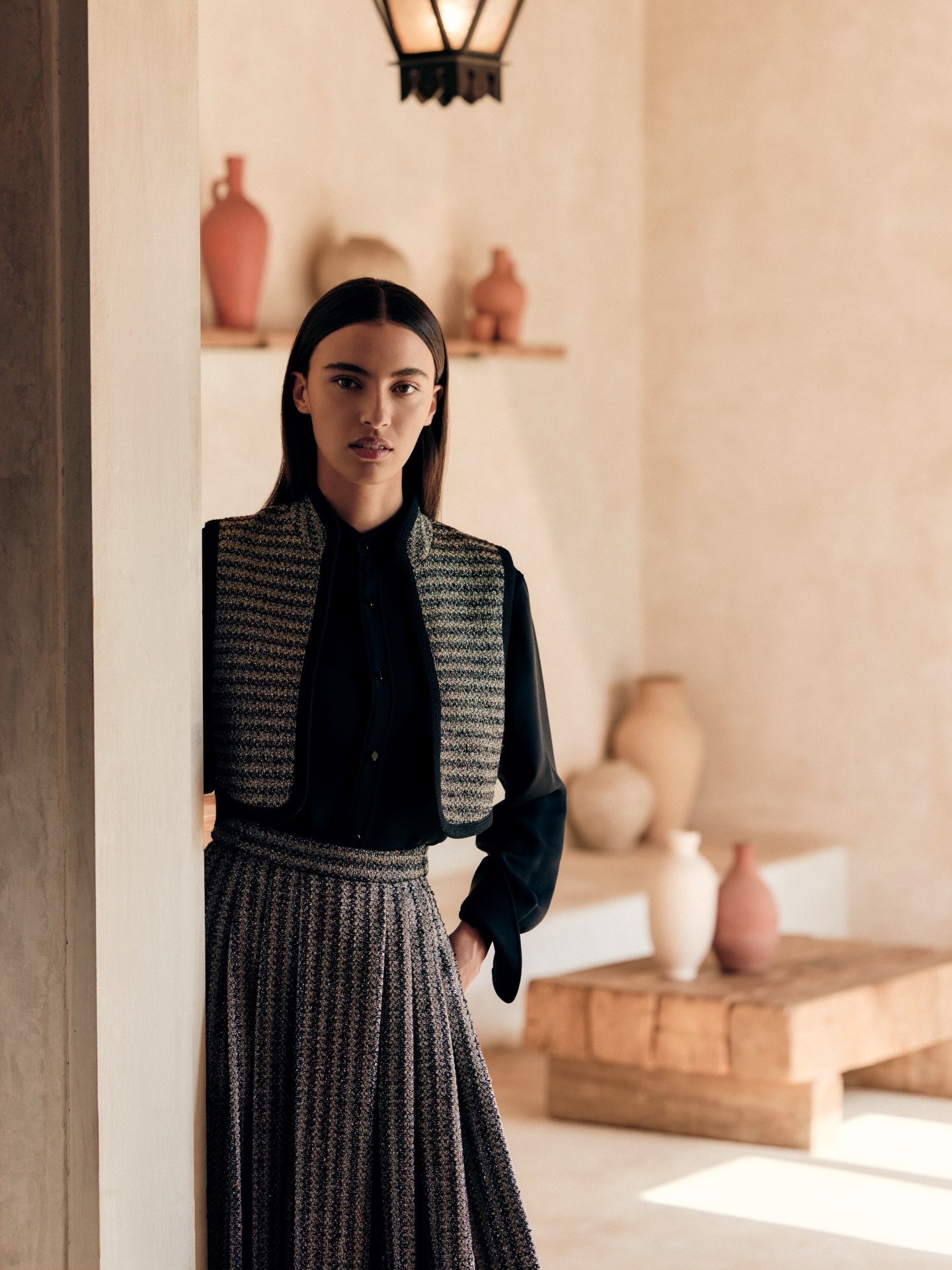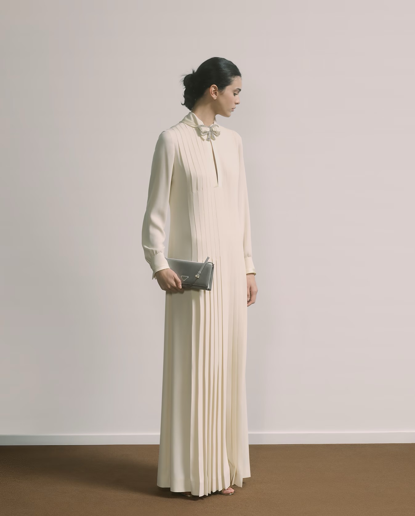 وتبرز الخامات الخفيفة مثل Re-Nylon في المعاطف العصرية، إلى جانب تنانير بطيات ناعمة وفساتين بوبلين بقالب أنيق يواكب إطلالات النهار، فيما تتألّق الأمسيات بفساتين من المخمل والساتان الحريري وقماش الدوشيس، مزدانة بتفاصيل كريستالية رفيعة تضيف لمسة احتفالية راقية.