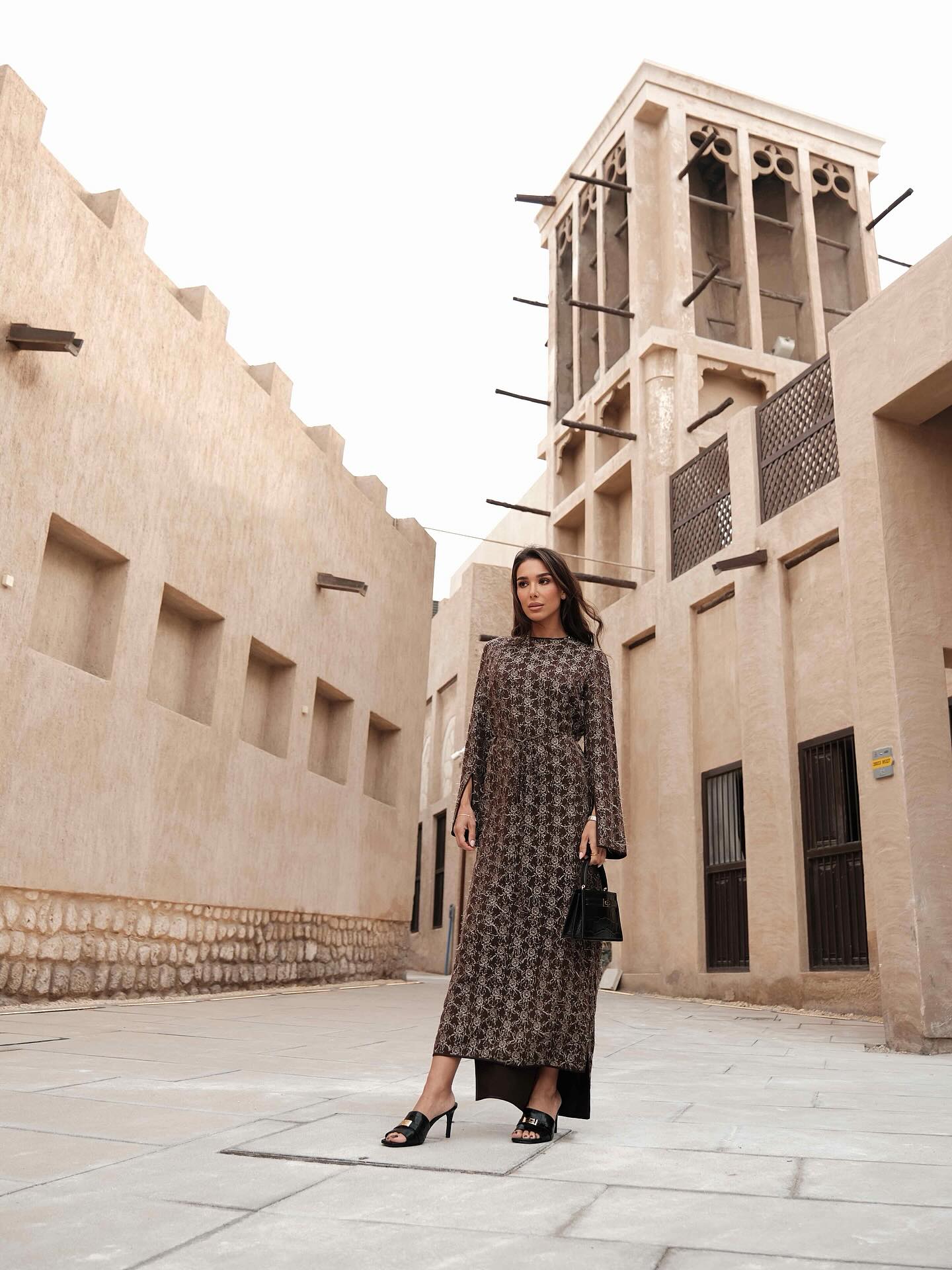 تتميز الإطلالات بنقوش راقية على الأقمشة، مع تطريزات ذهبية ولمسات من الأحجار اللامعة التي تضيف بريقًا وفخامة. كما تحتوي بعض القطع على نسخ مطرّزة يدويًا بدقة، لتعكس حرفة عالية وتفاصيل دقيقة تمنح كل إطلالة لمسة احتفالية أنيقة.