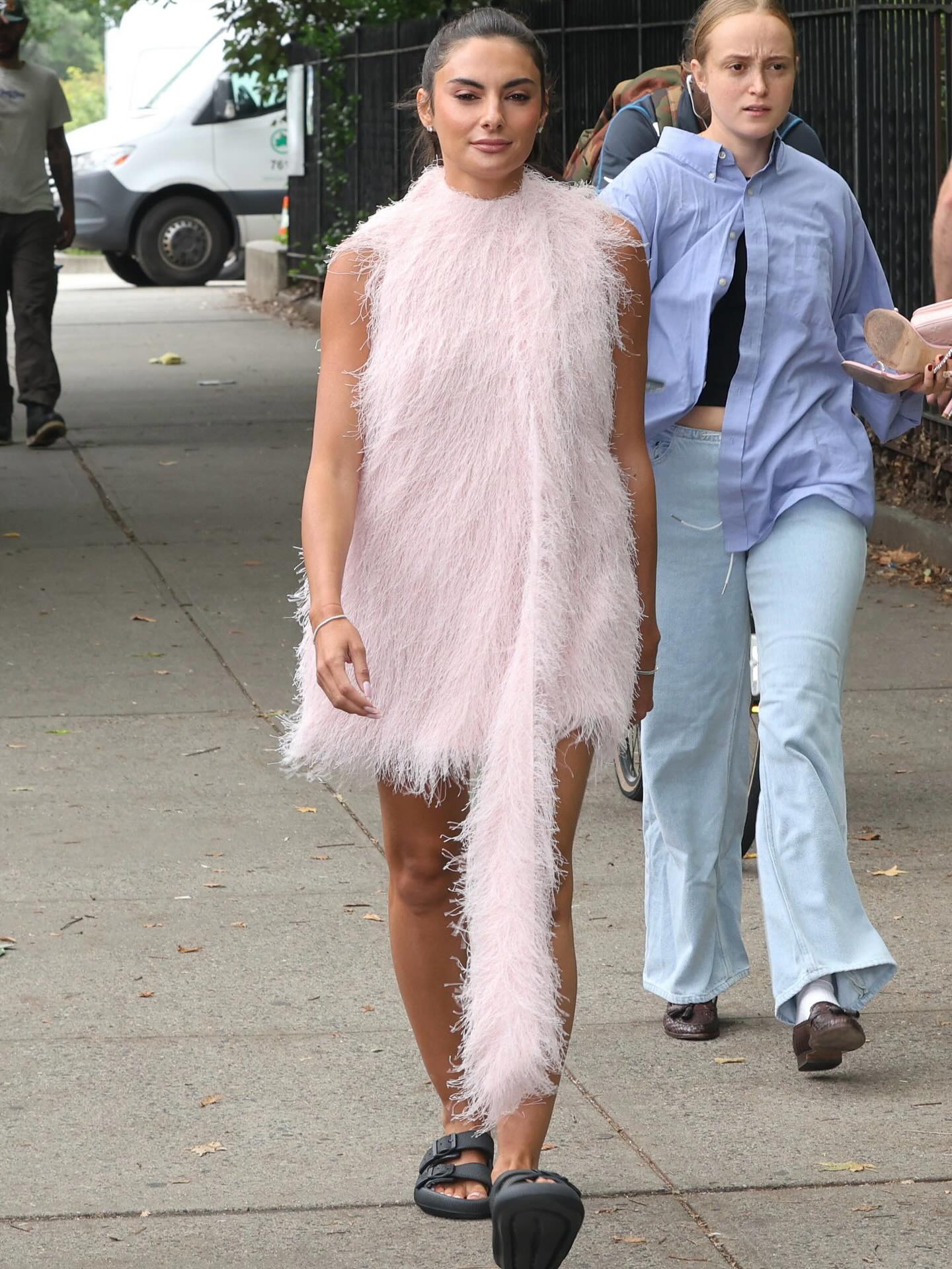 كما تم رصد Paige DeSorbo في موقع تصوير فيلم The Devil Wears Prada الأكثر انتظارًا في عالم الموضة، مرتدية فستانًا مزينًا بالريش من clea galerie، تم تنسيقه مع صندل Birkenstocks الكلاسيكي، لتثبت أن الأناقة الراقية يمكن أن تتناغم مع عناصر الراحة اليومية، مانحةً الإطلالة لمسة عصرية شبابية ومبتكرة.