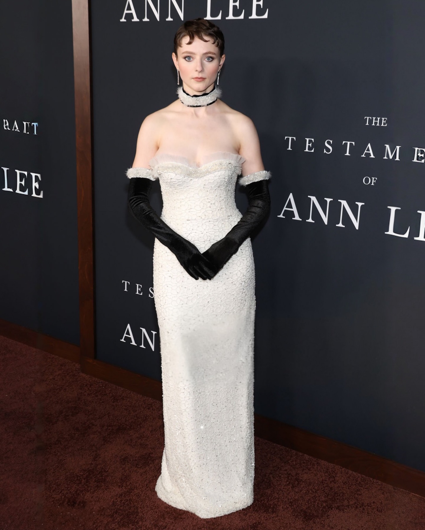 أما Thomasin McKenzie فظهرت بإطلالة أنثوية ناعمة من Rodarte FW25، اختارت فيها فستانًا أبيض طويلًا بقصة كورسيه رقيقة تبرز القوام برومانسية هادئة. تميّز الفستان بنقشات دقيقة أضفت ملمسًا فنيًا ناعمًا، مع أكتاف مكشوفة ولمسات فرو خفيفة استحضرت أجواء هوليوود الكلاسيكية. وأكملت الإطلالة بقفازات سوداء طويلة منحتها تباينًا أنيقًا، إلى جانب أقراط Diamant de Venus من Sophie Bille Brahe التي أضافت بريقًا بسيطًا ومتوازنًا.