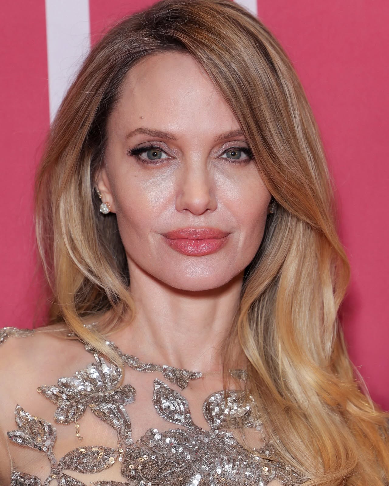 إطلالة أنجلينا جولي لم تكن مجرد فستان أنيق لحضور العرض، بل عكست أيضًا أجواء فيلم Couture الذي تدور أحداثه خلف كواليس أسبوع الموضة. ارتدت النجمة فستانًا شبه شفاف من دار Givenchy، طويل، مزينًا بتطريزات معدنية وترتر فضّي على شكل زهور، ليظهر مزيجًا رائعًا من الرقة والقوة في آن واحد.